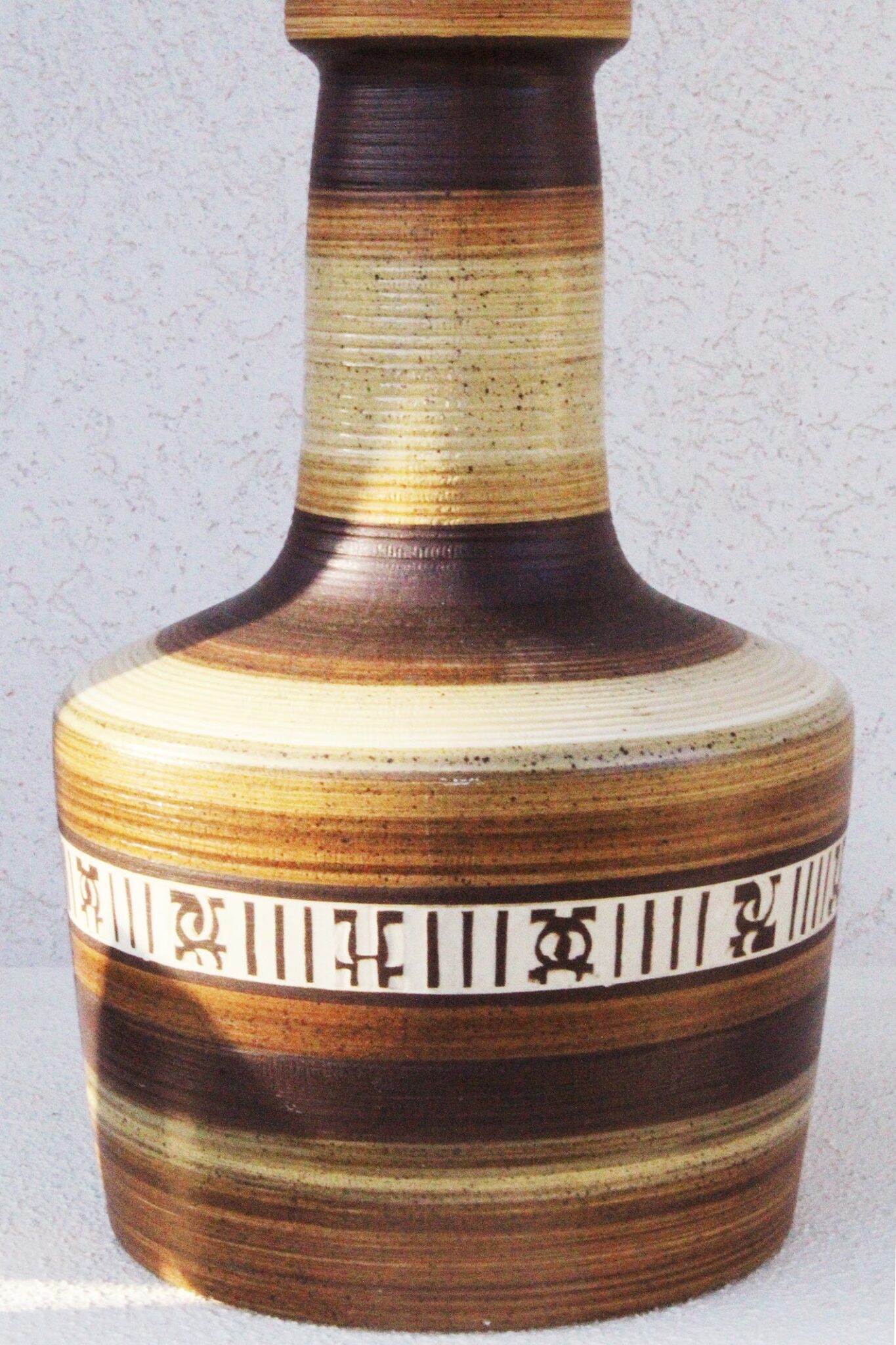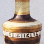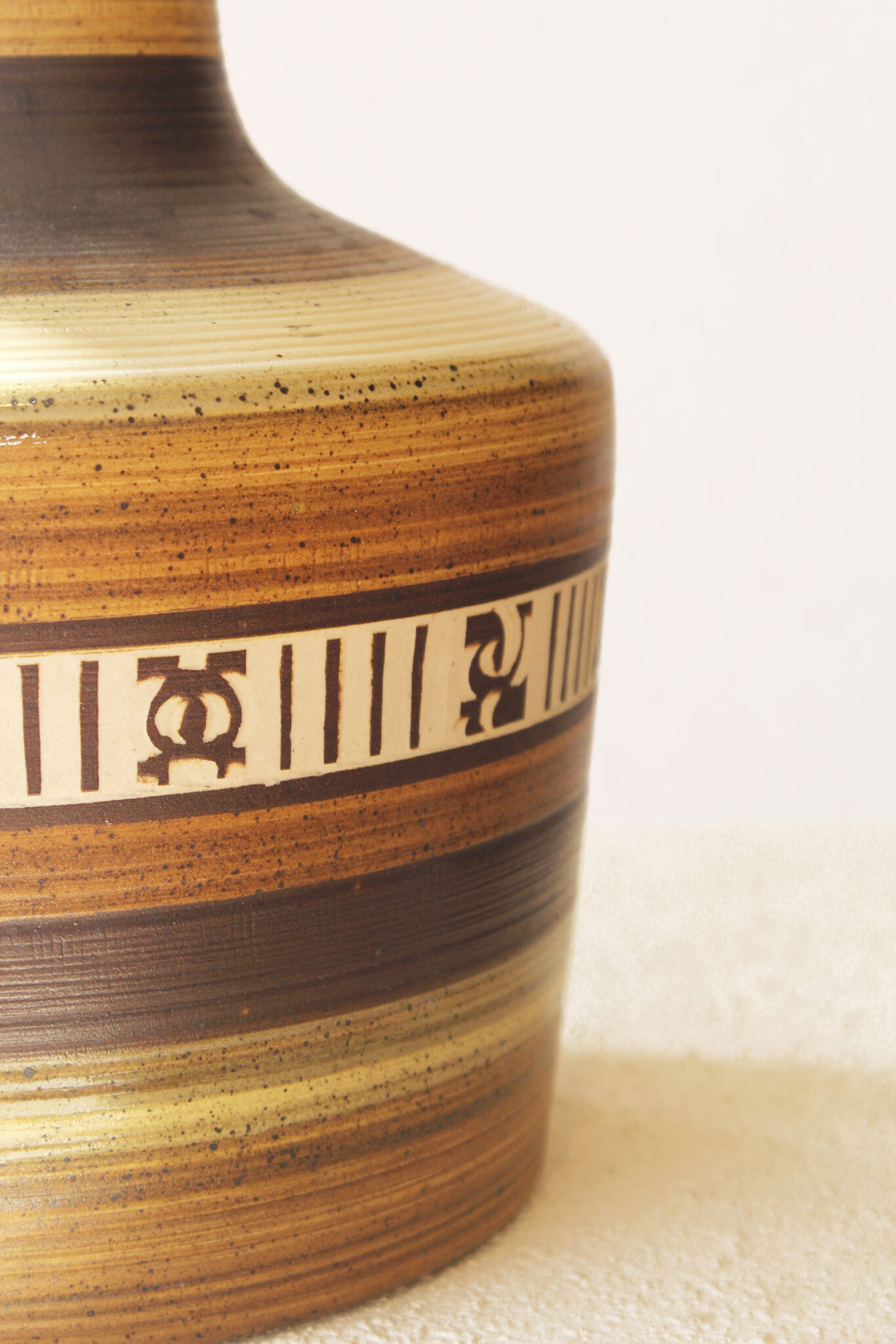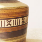 הכלי מעוטר בצורה ידנית בפסי צבע חומים טבעיים ובמוטיביים גאומטריים שהיו מזוהים לשפה העיצובית של הכלים שייצרו במפעל, לכלי מרקם ייחודי מאט ומחוספס המעניק תחושה של חומר גולמי.