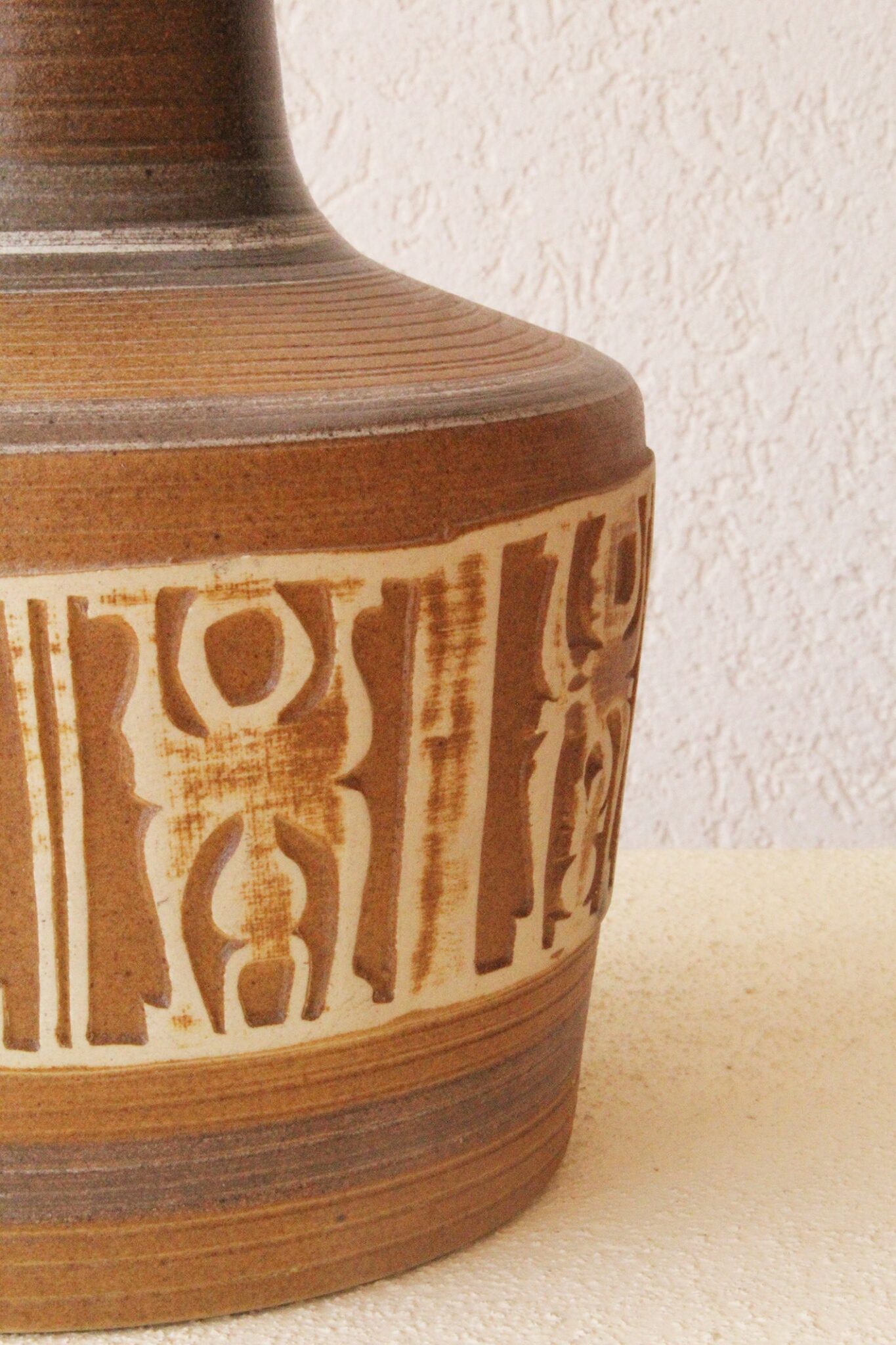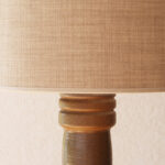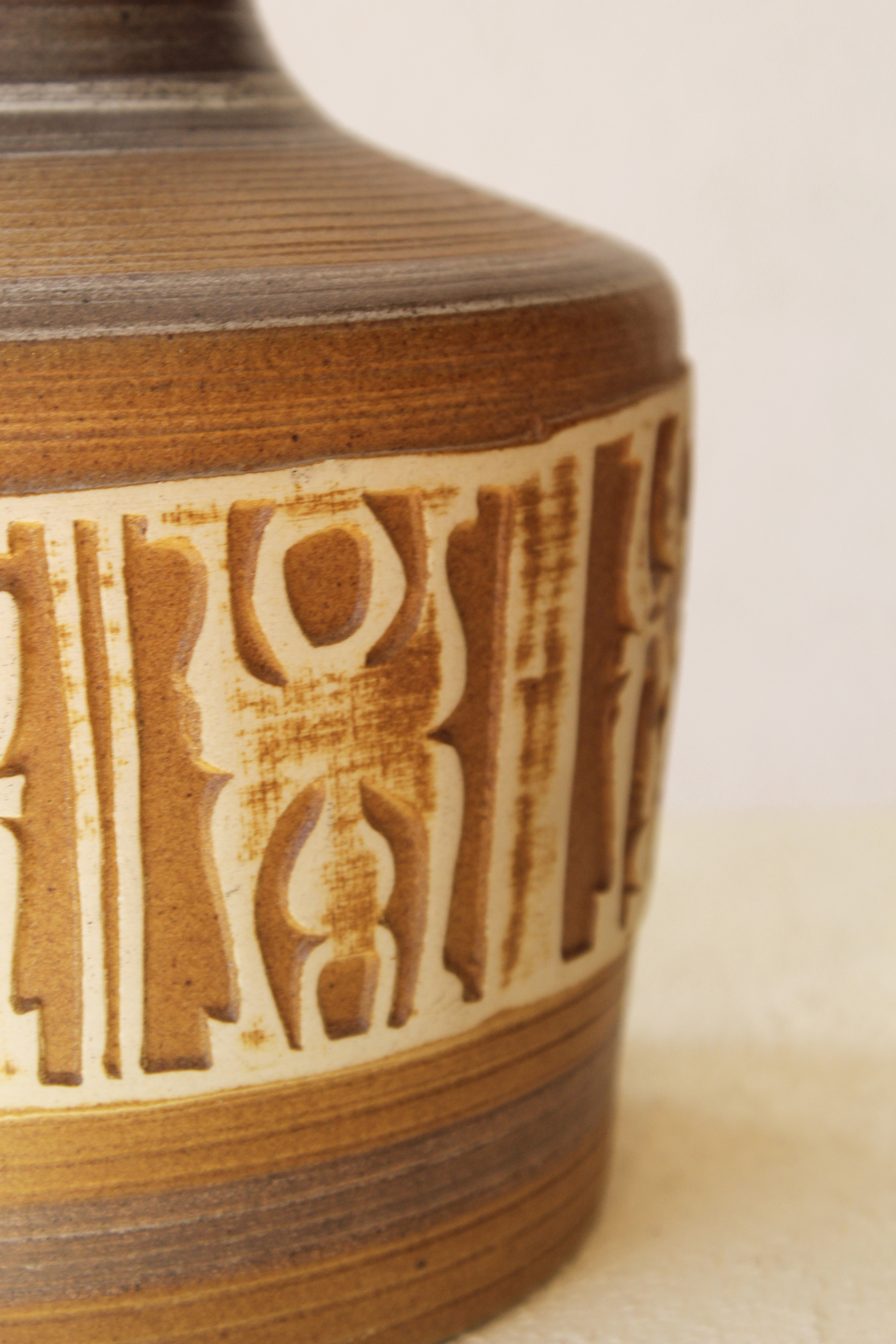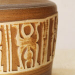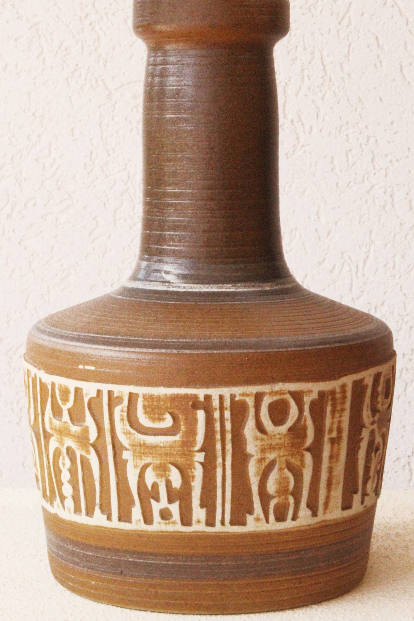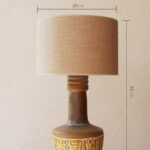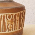 המנורה משלבת עיצוב עגול ורך עם צוואר גבוה שמבליט נוכחות פיסולית ועוצמתית. הכלי צבוע בגוונים חומים עמוקים בגימור מאט וטקסטורה טבעית שמבליטה את חומר הגלם. החלק התחתון של הכלי מעוטר בדוגמה גאומטרית חרוטה ביד – שנחשף בגוון שמנת טבעי דרך שכבת הזיגוג.