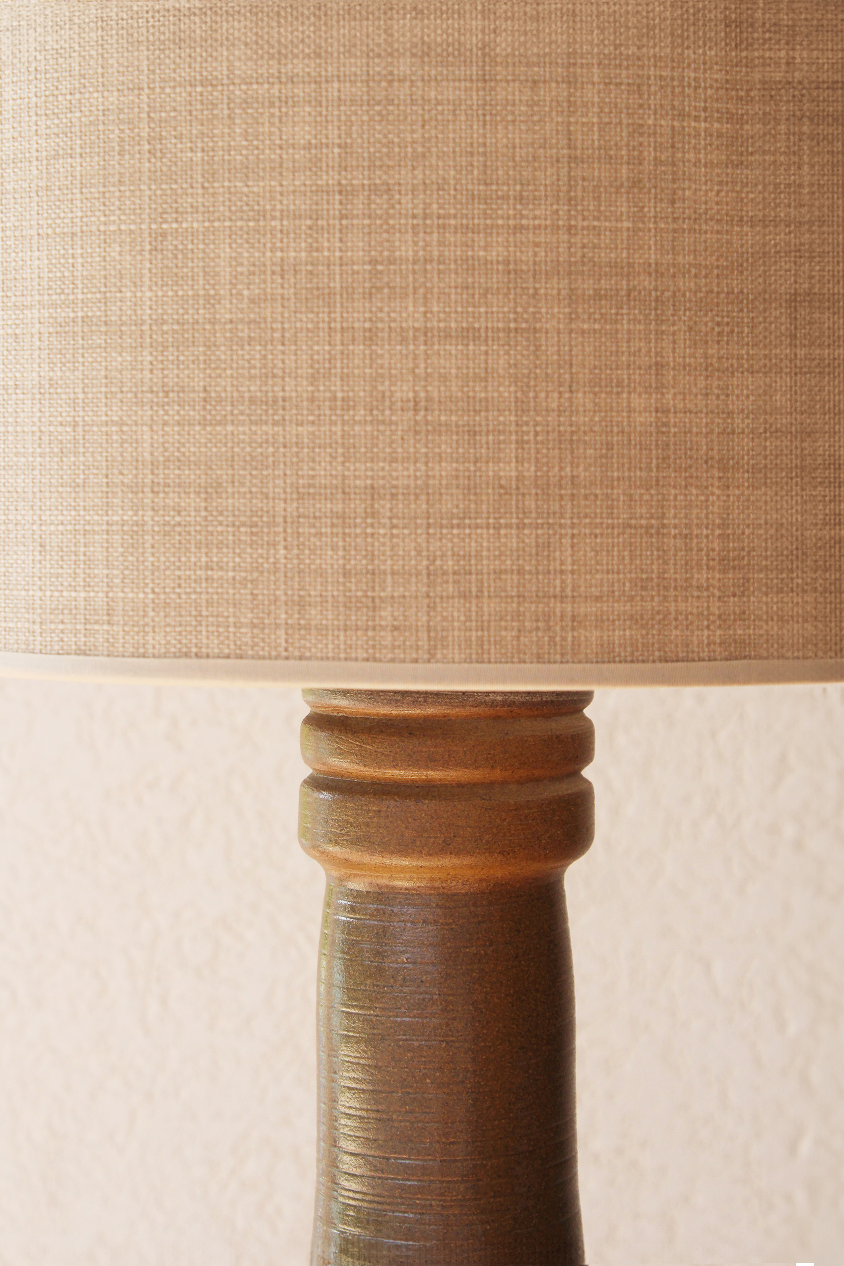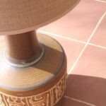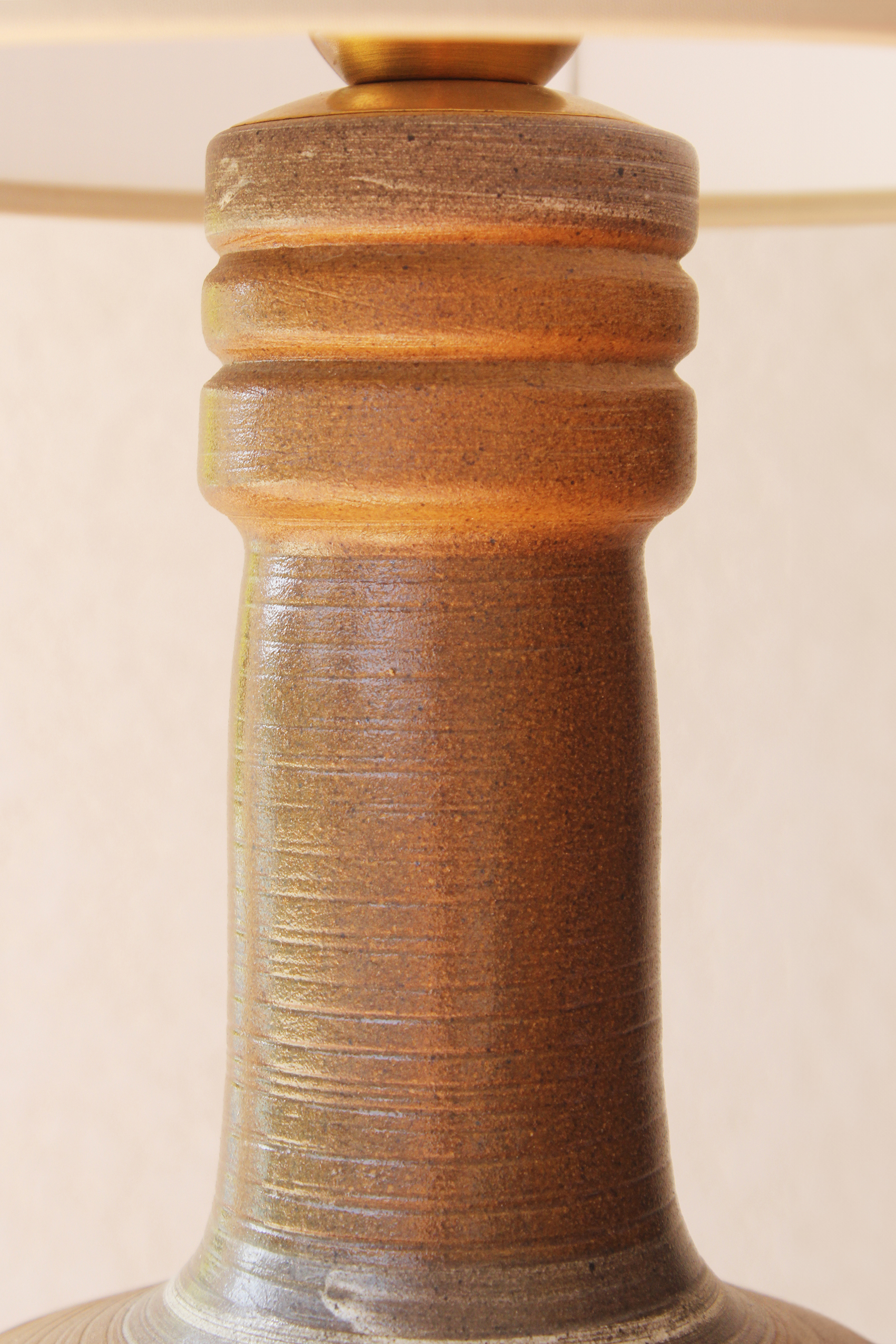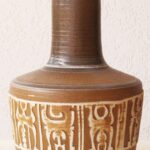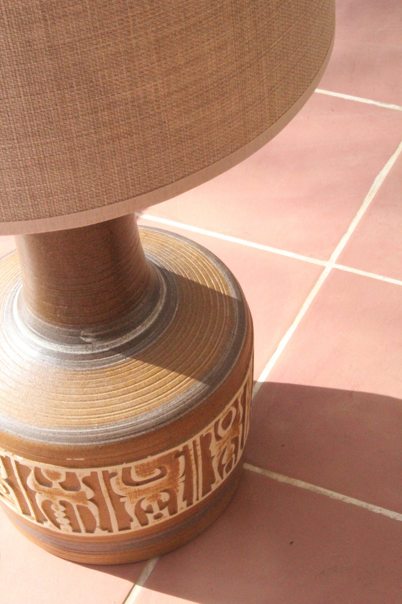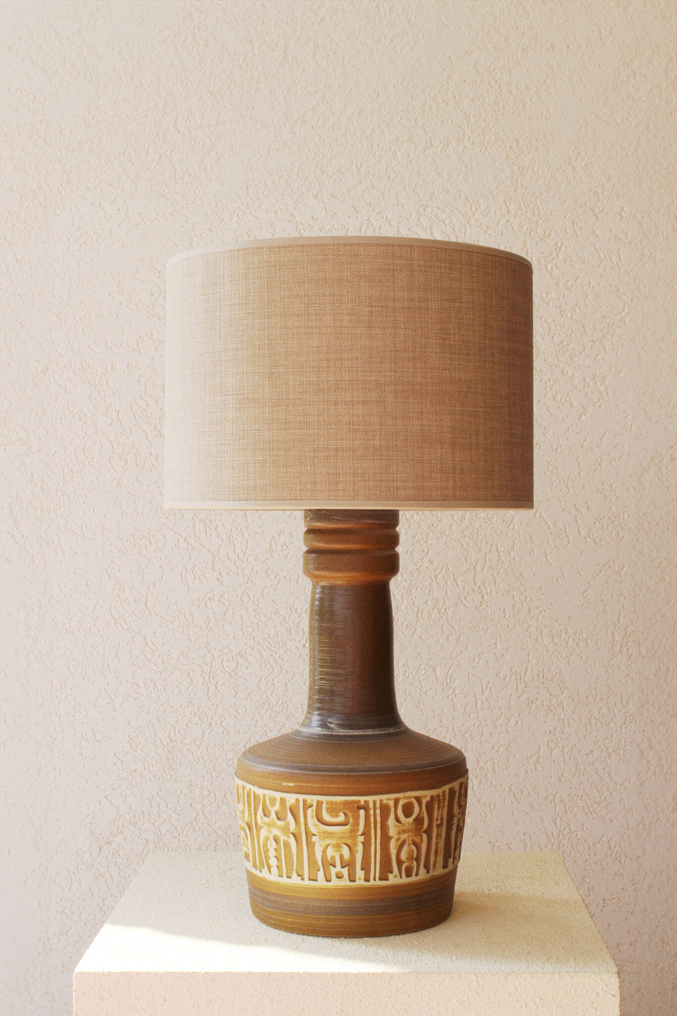 המנורה משלבת עיצוב עגול ורך עם צוואר גבוה שמבליט נוכחות פיסולית ועוצמתית. הכלי צבוע בגוונים חומים עמוקים בגימור מאט וטקסטורה טבעית שמבליטה את חומר הגלם. החלק התחתון של הכלי מעוטר בדוגמה גאומטרית חרוטה ביד – שנחשף בגוון שמנת טבעי דרך שכבת הזיגוג.