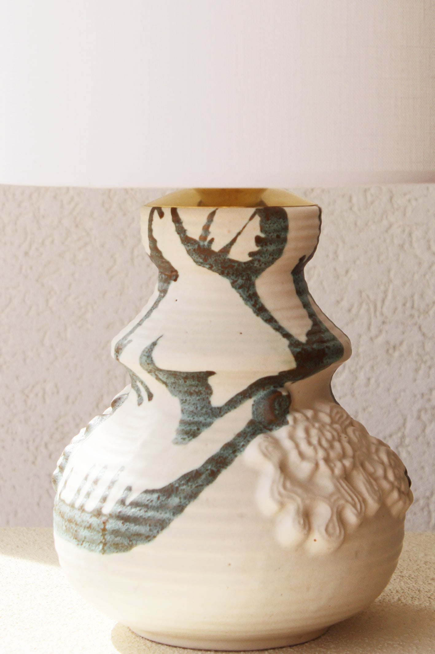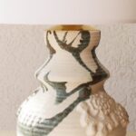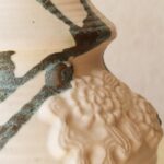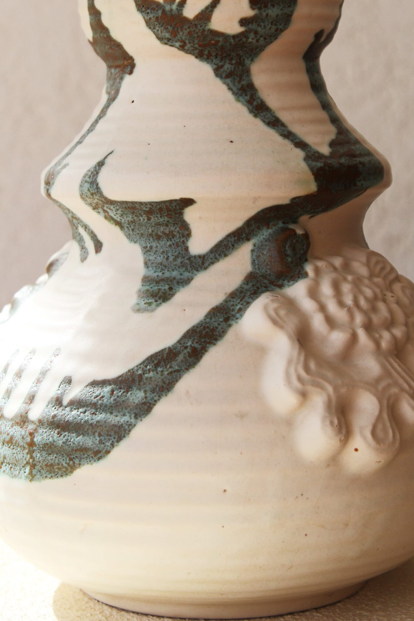 על גבי הכלי מופיעות נזילות צבע בגווני חום וירוק המזכירות לבה זורמת, משני צדדי הכלי מופיעים תבליטים מעוטרים בעבודת יד שמוסיפות מראה תלת מימדי.
