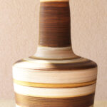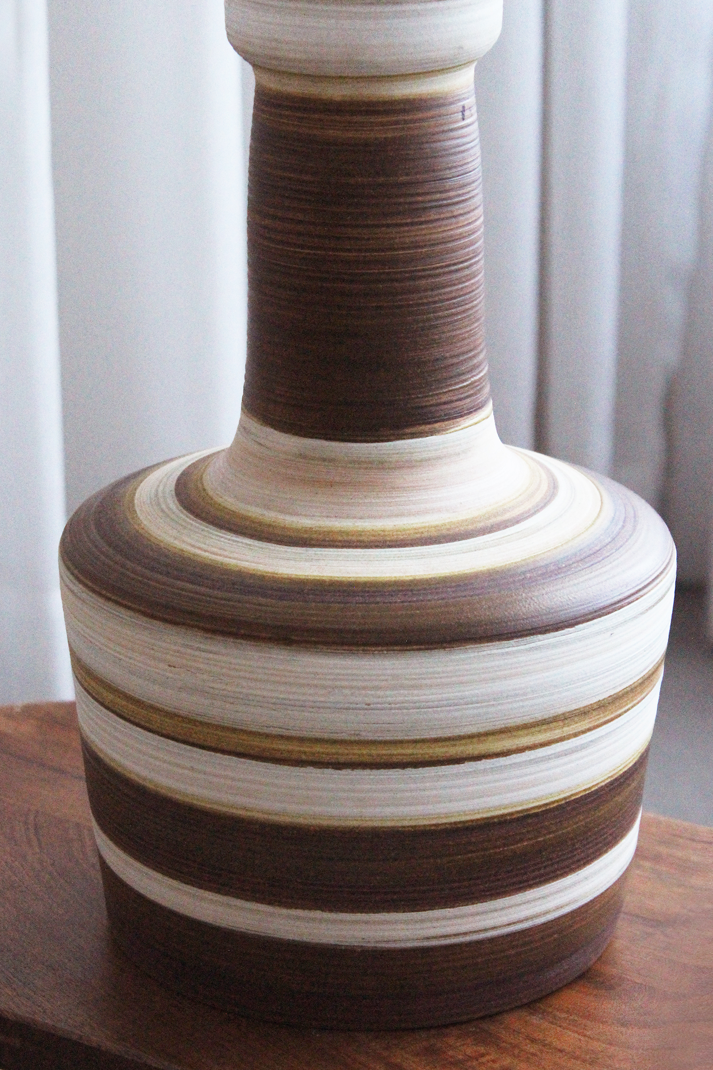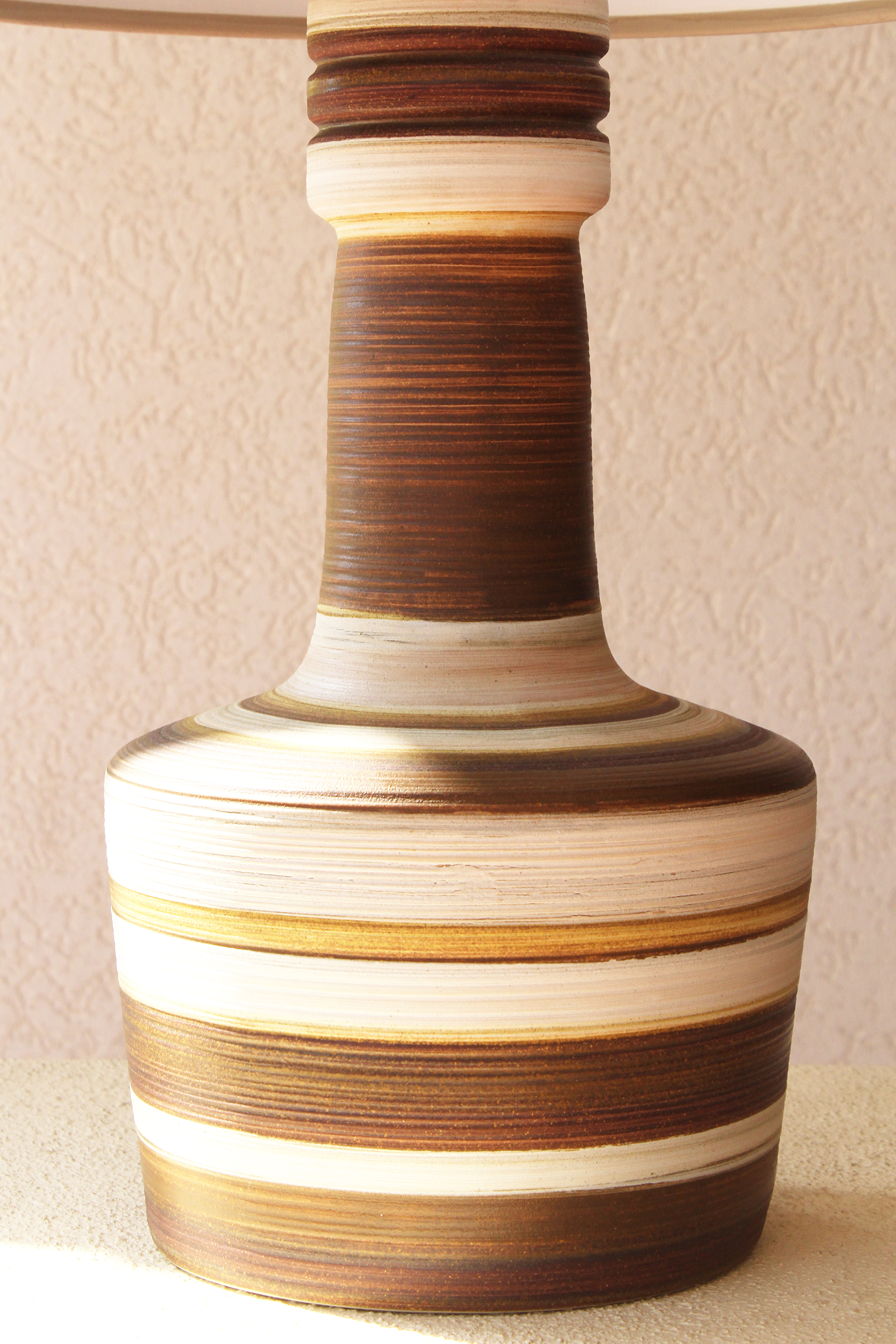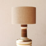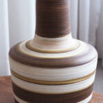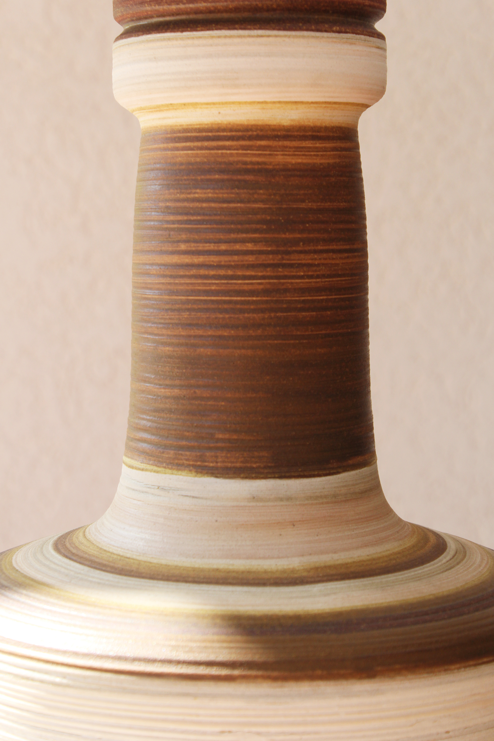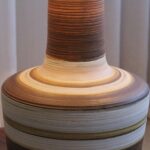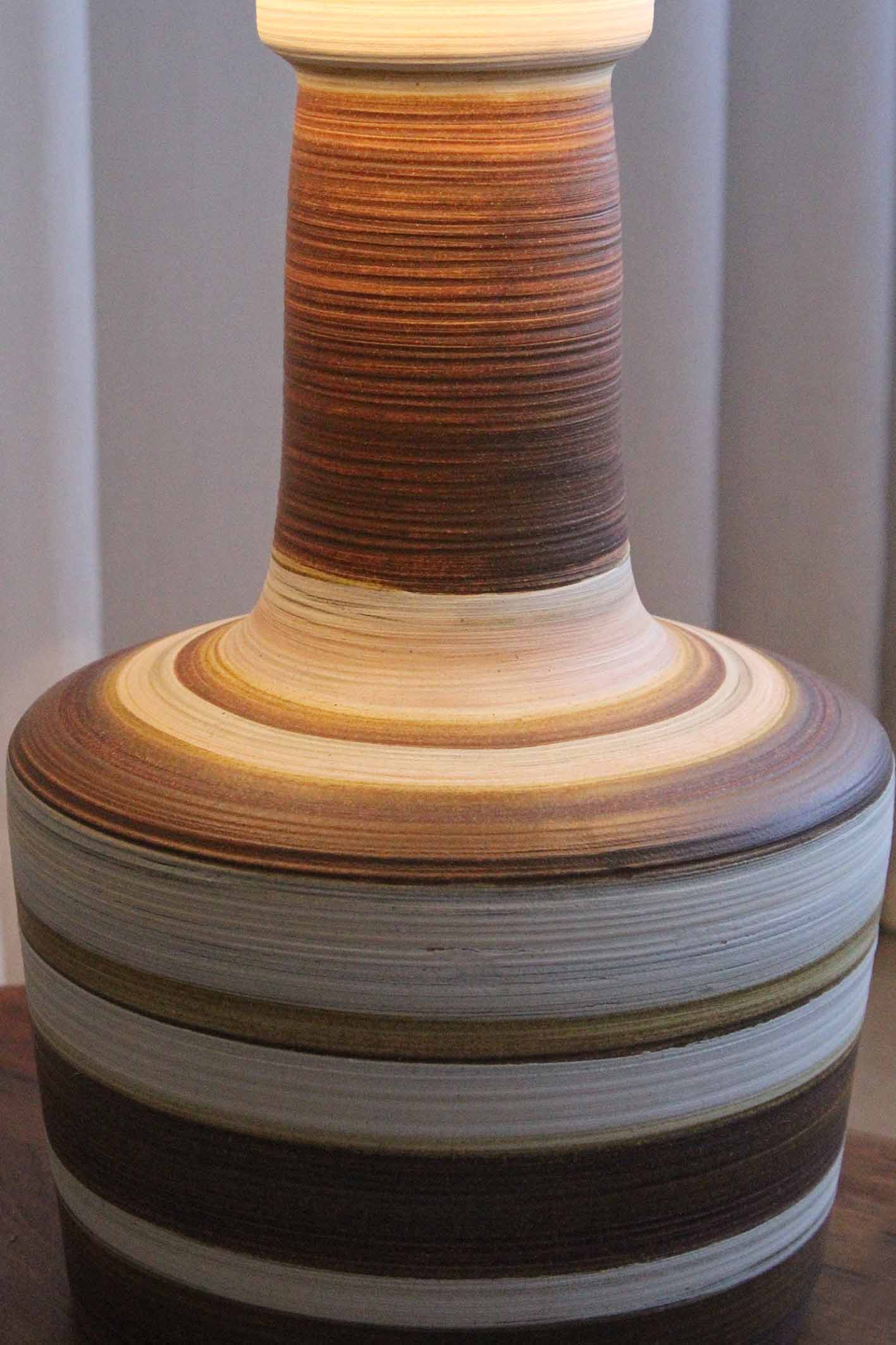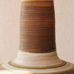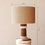 המנורה משלבת עיצוב עגול ורך עם צוואר גבוה שמבליט נוכחות פיסולית ועוצמתית. הייחודיות של הכלי נמצאת בצבעוניות ובדוגמת הפסים שמקיפים אותו בגווני אדמה, הגימור של הכלי הוא מאט בטקסטורה טבעית.