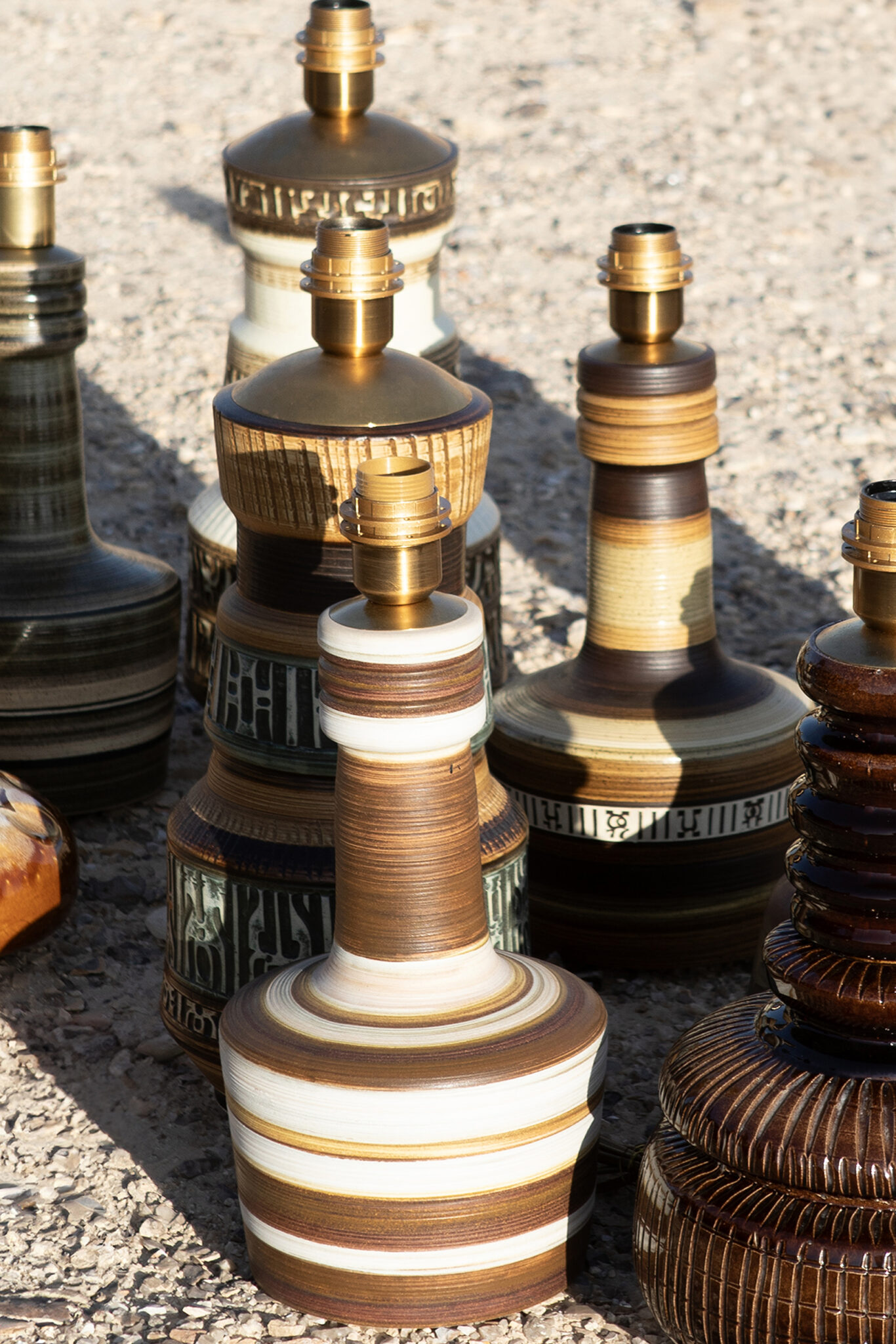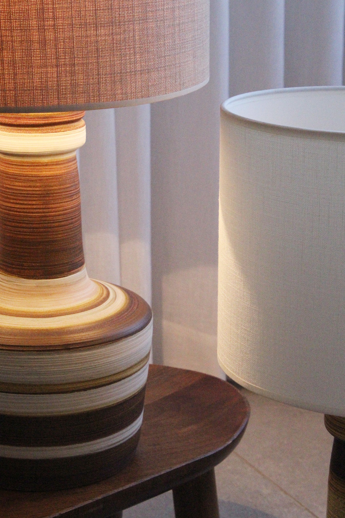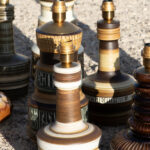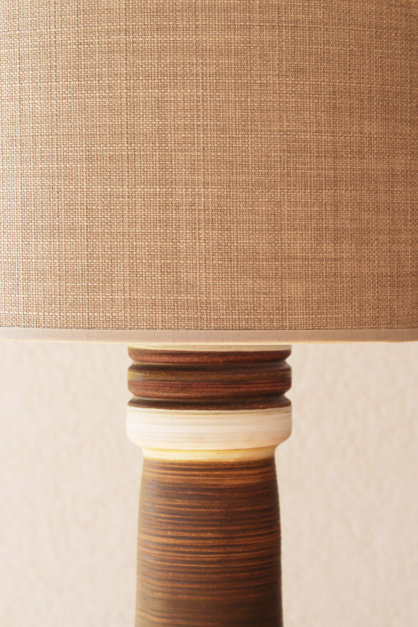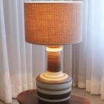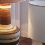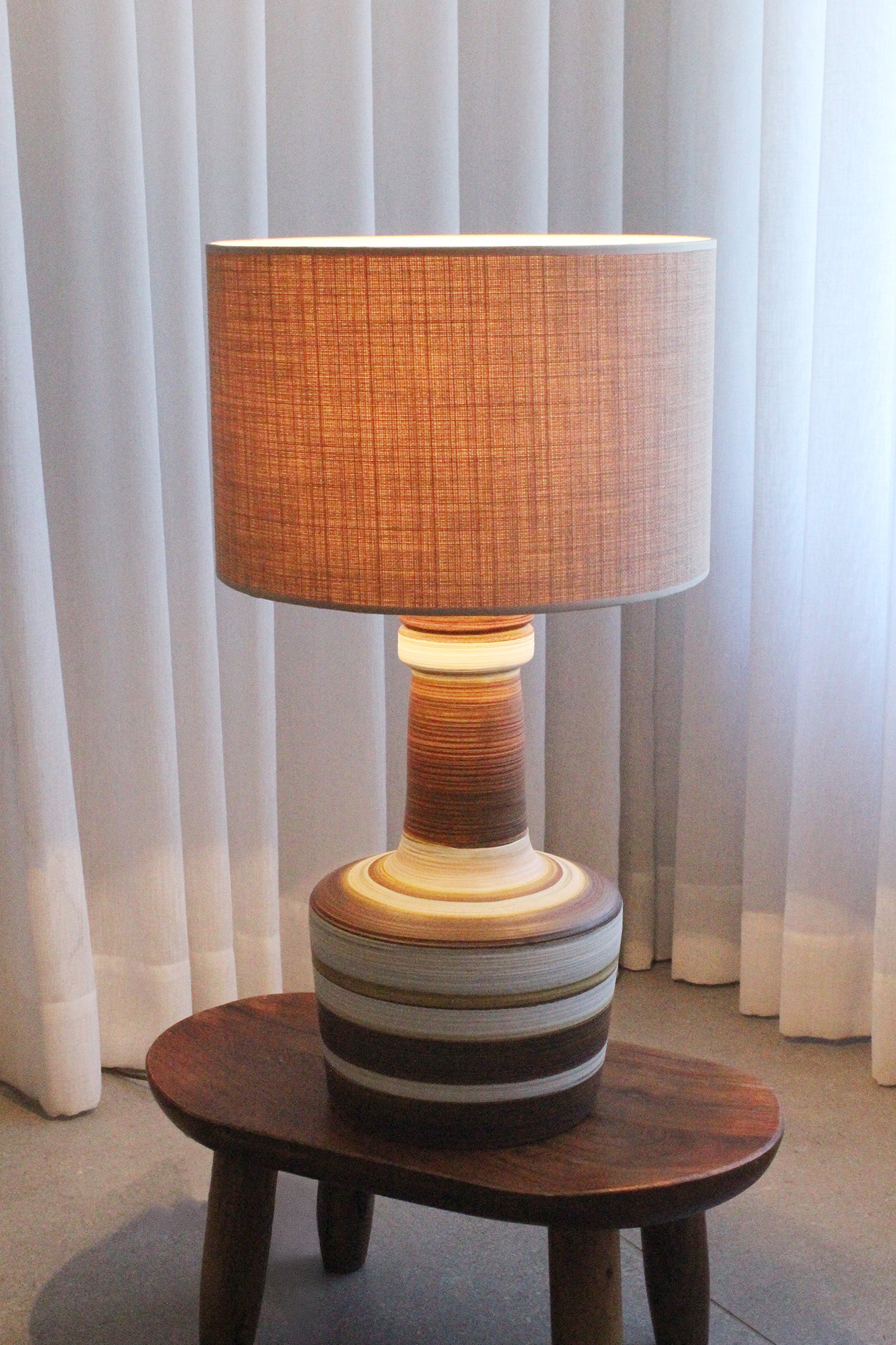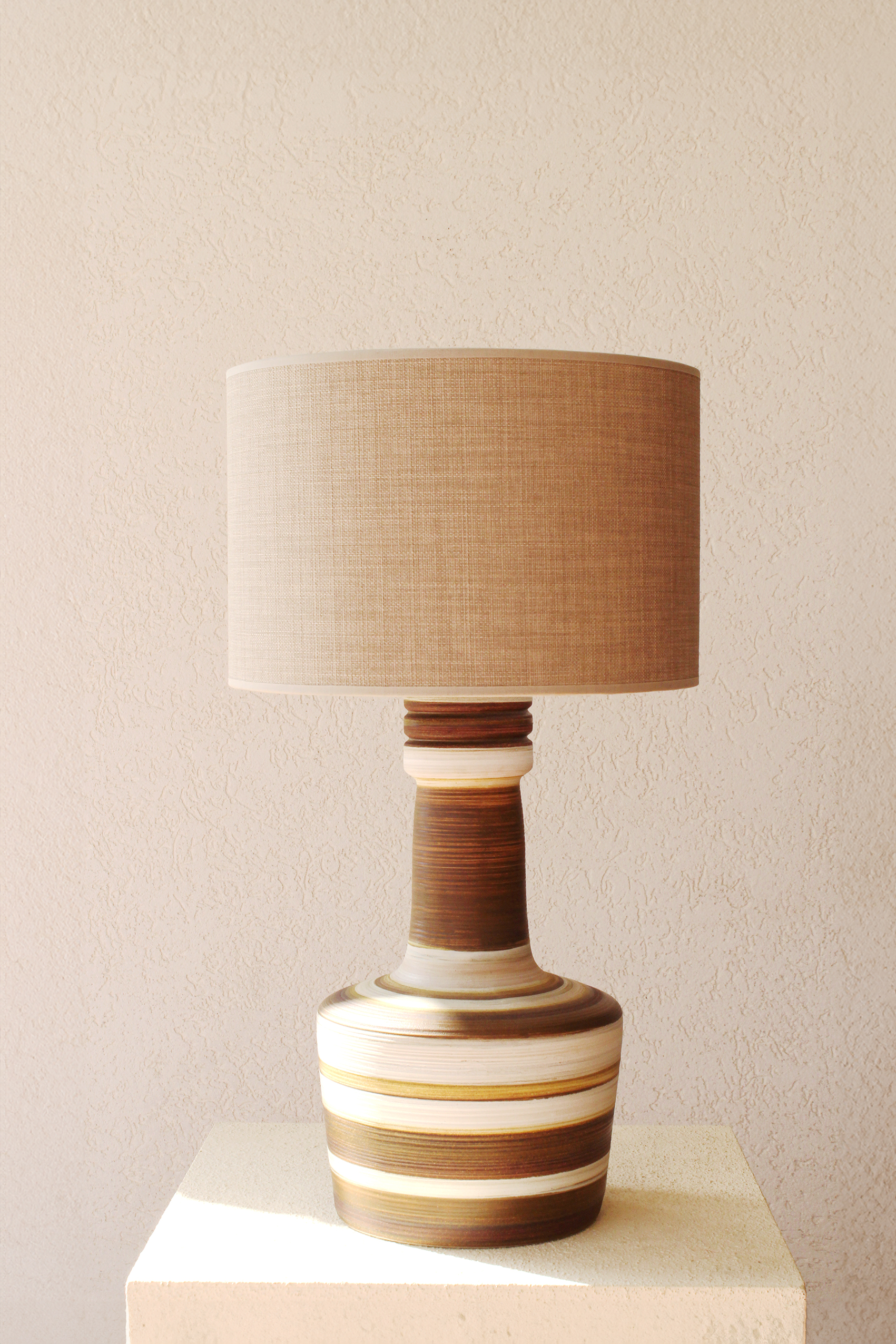 המנורה משלבת עיצוב עגול ורך עם צוואר גבוה שמבליט נוכחות פיסולית ועוצמתית. הייחודיות של הכלי נמצאת בצבעוניות ובדוגמת הפסים שמקיפים אותו בגווני אדמה, הגימור של הכלי הוא מאט בטקסטורה טבעית.