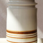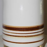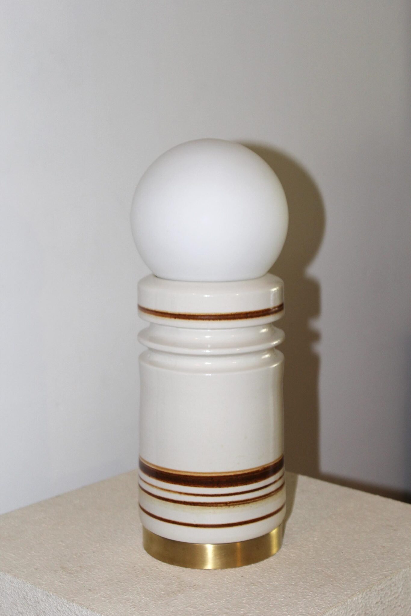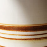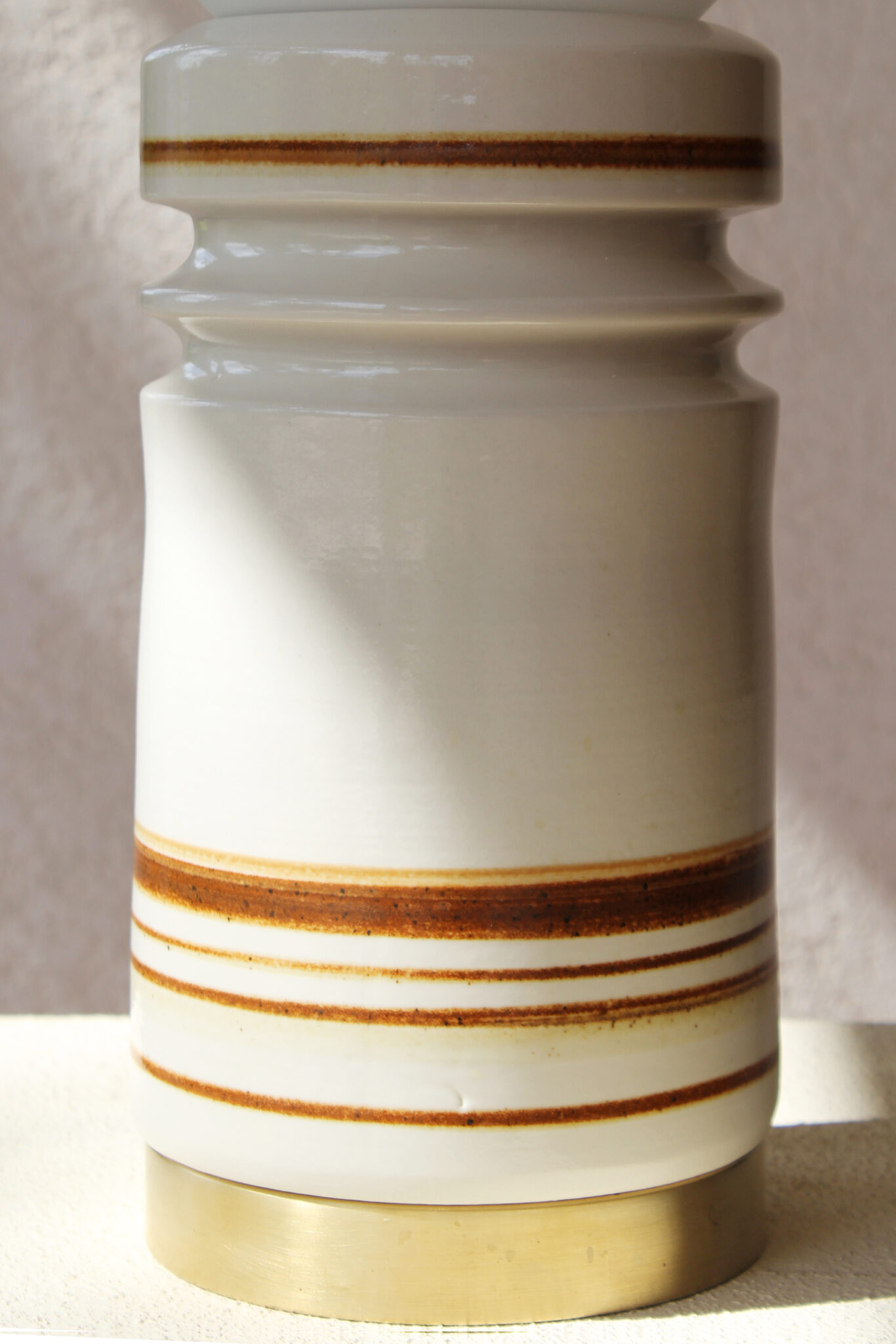 הכלי בגוון שמנת רך בגימור מבריק. מעוטר בפסי חום עדינים המעניקים לו עומק וטקסטורה ייחודית, משולב עם בסיס פליז שמשלים את המראה ומוסיף נגיעה חמה וטבעית לחומר הקרמי.