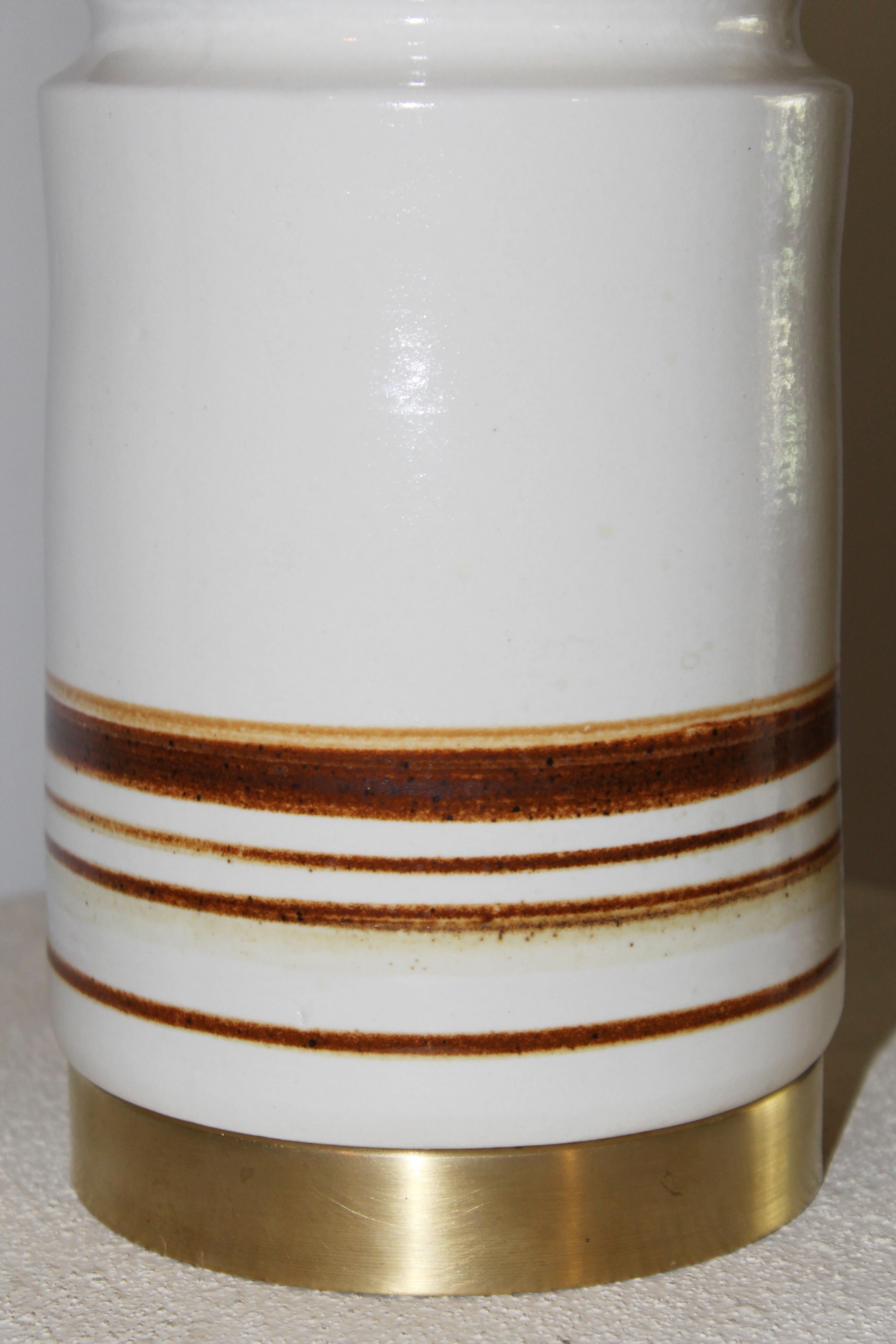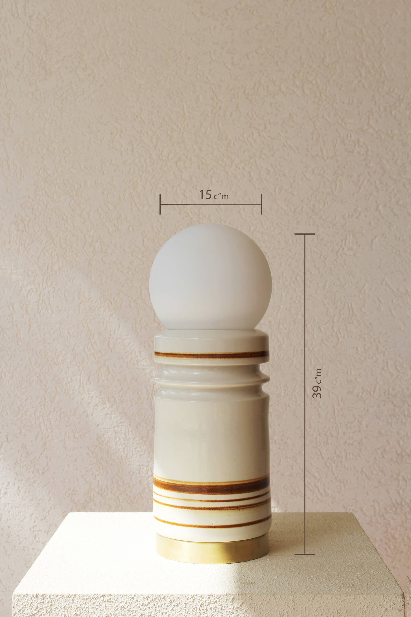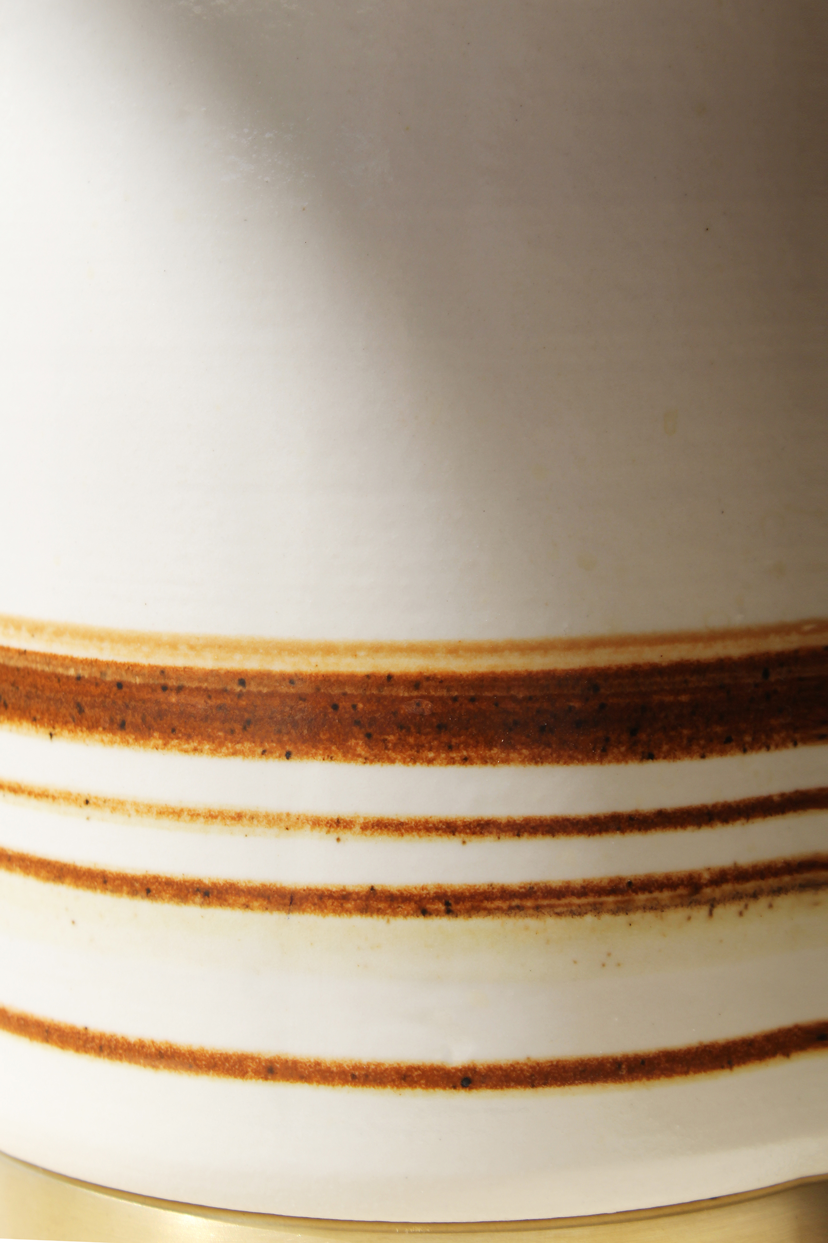 הכלי בגוון שמנת רך בגימור מבריק. מעוטר בפסי חום עדינים המעניקים לו עומק וטקסטורה ייחודית, משולב עם בסיס פליז שמשלים את המראה ומוסיף נגיעה חמה וטבעית לחומר הקרמי.