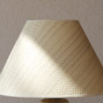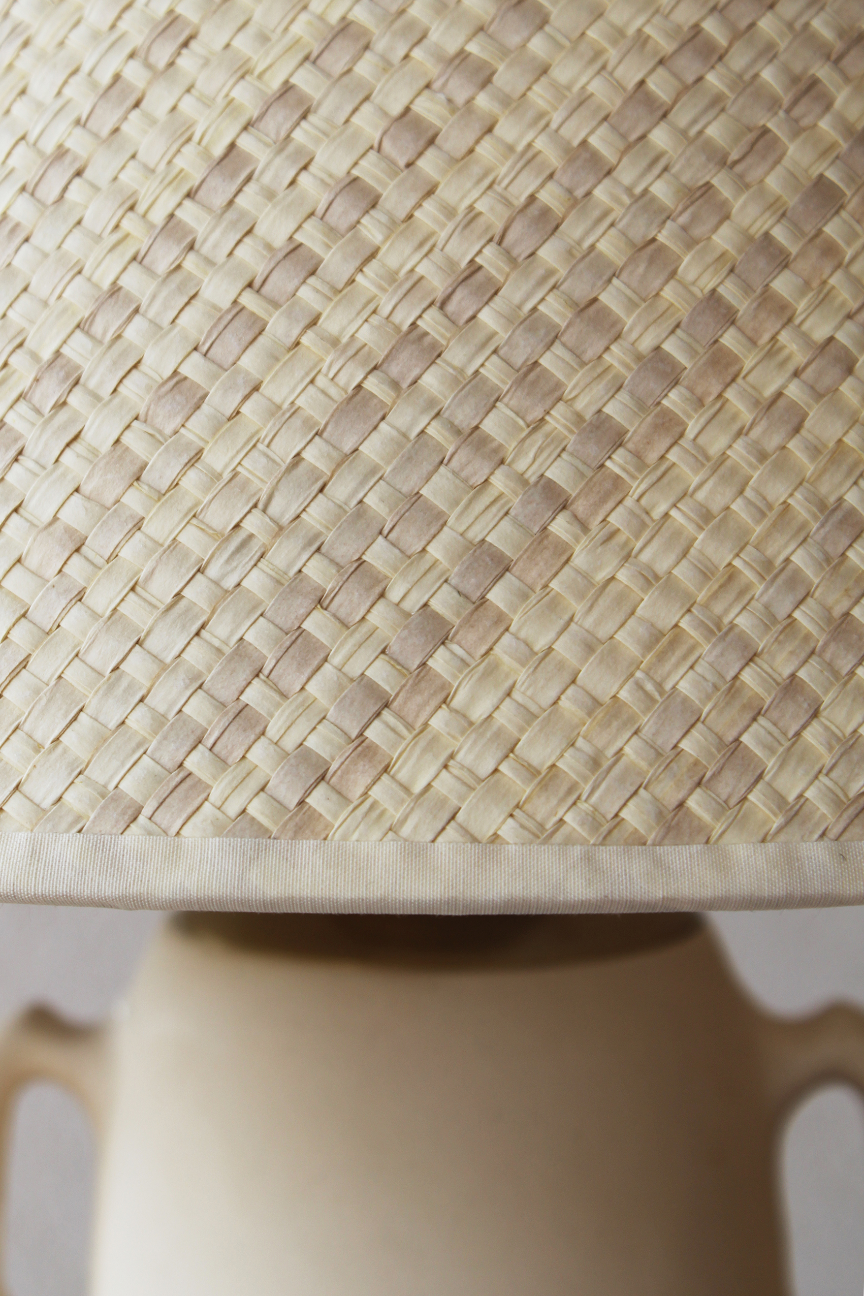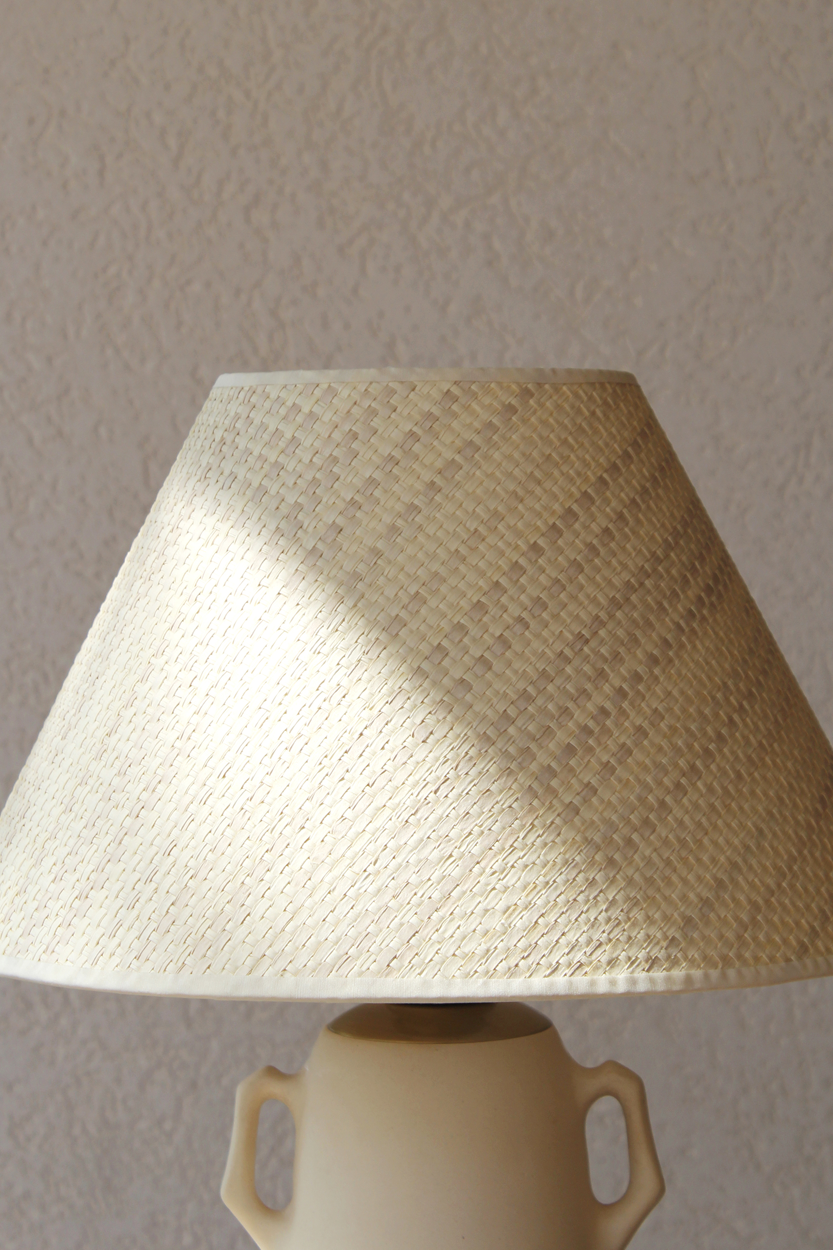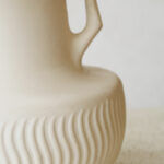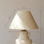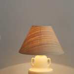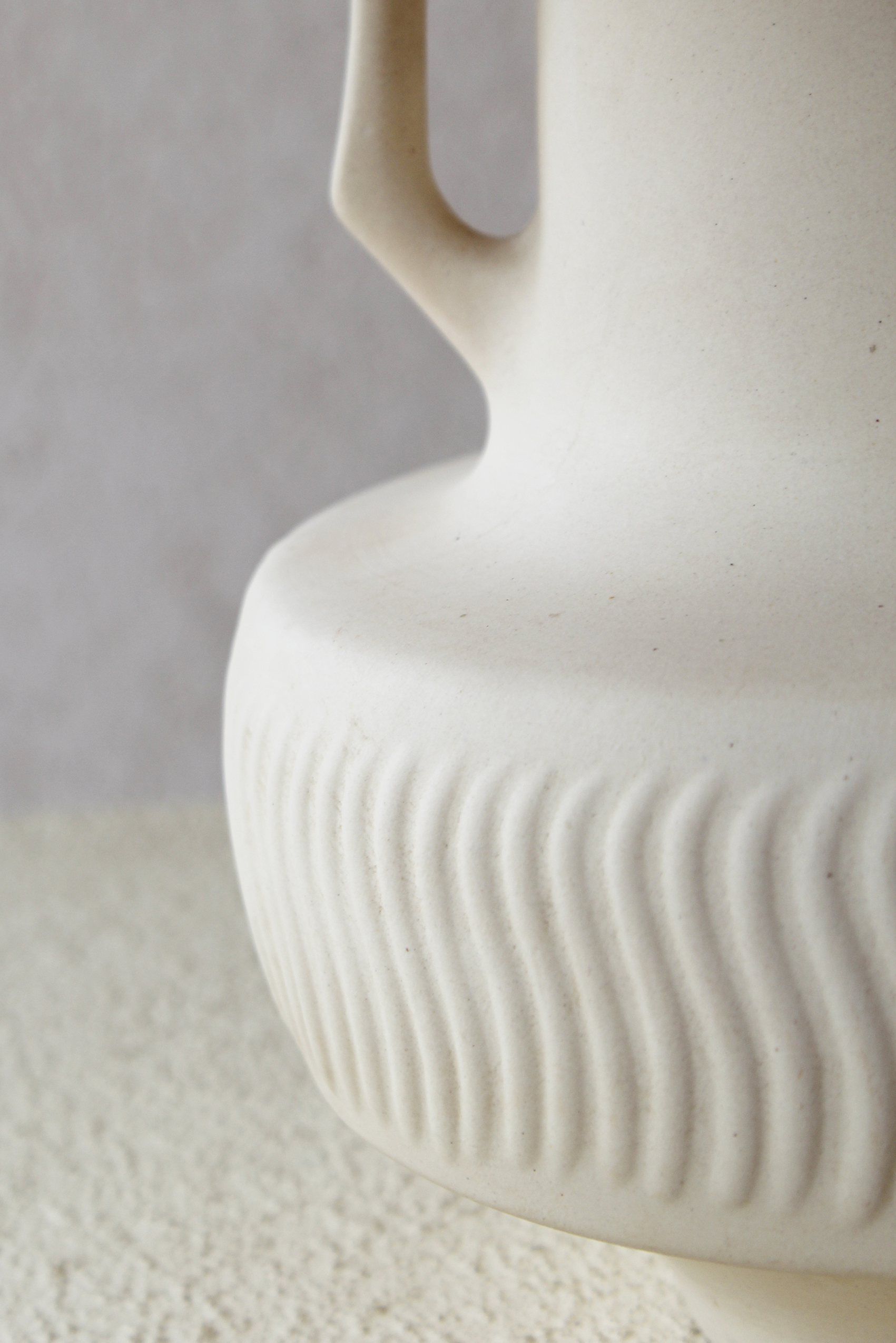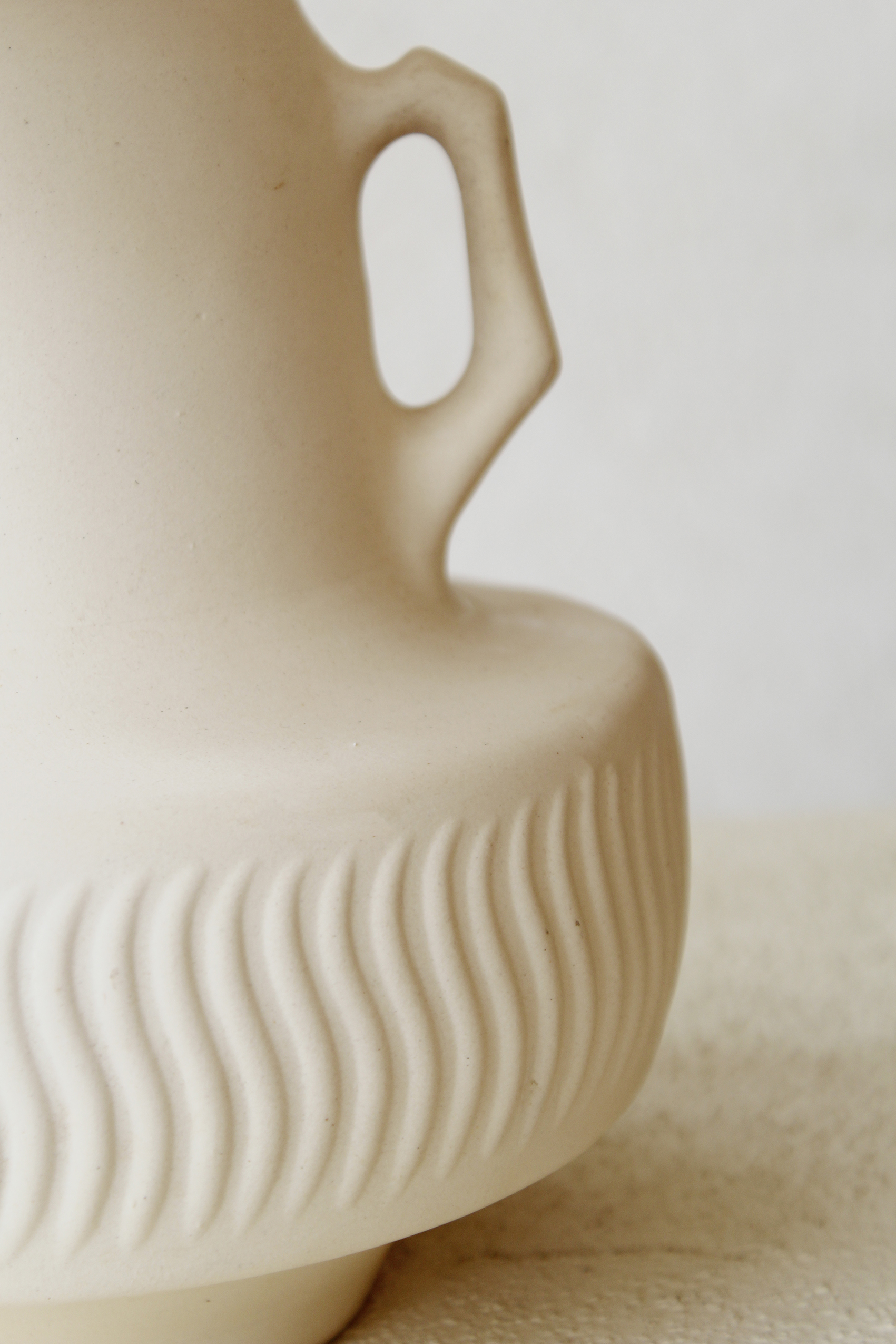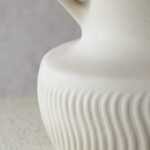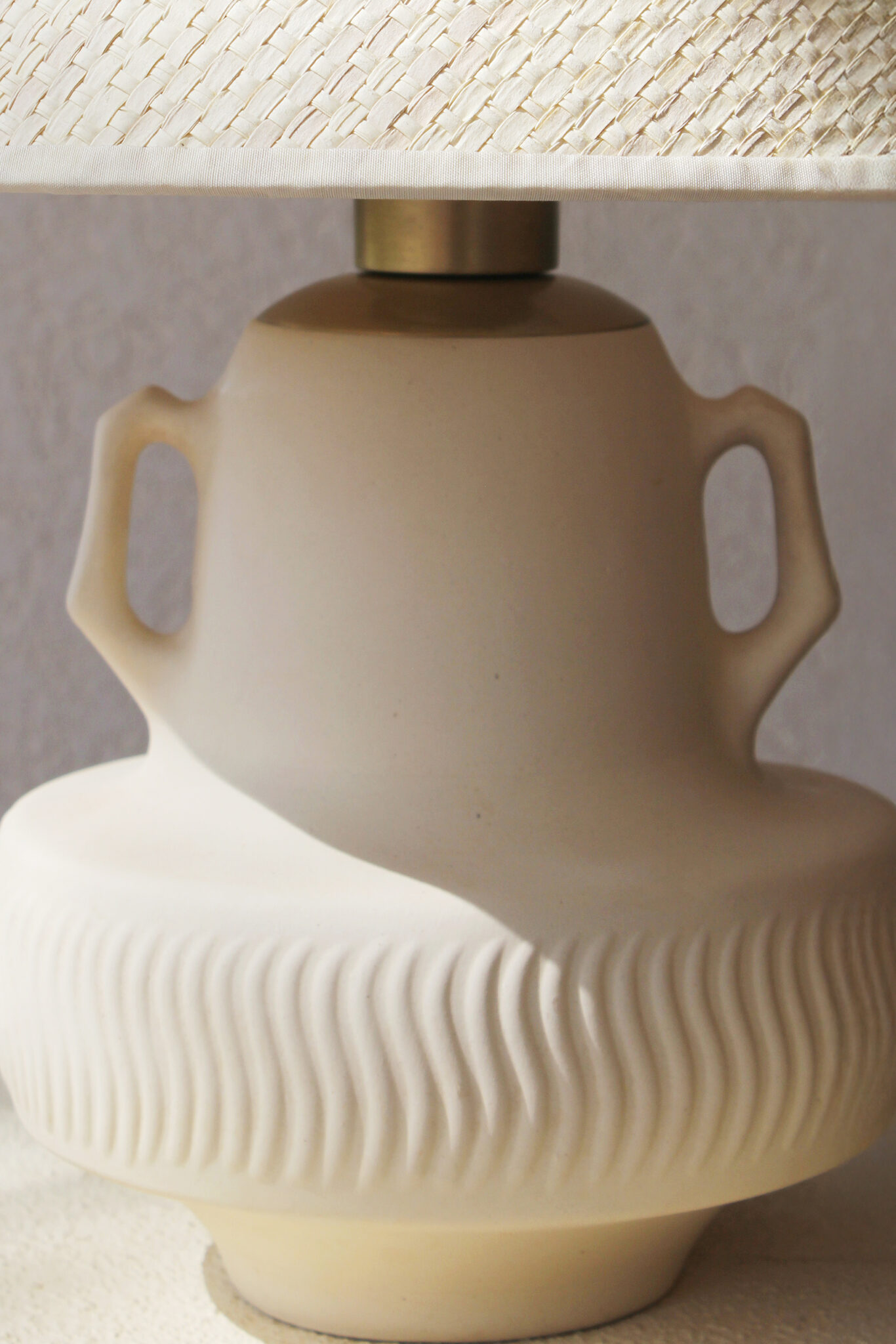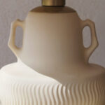 בסיס המנורה צבוע בגוון לבן רך בגימור מאט, בחלקו התחתון מופיעה טקסטורה גלית ועדינה היוצרת תנועה רכה המוסיפה עומק ותנועה. שתי ידיות קטנות משני צידי הכלי המעניקות לו אופי קלאסי ופיסולי.