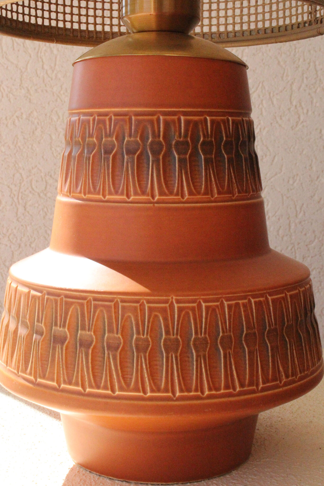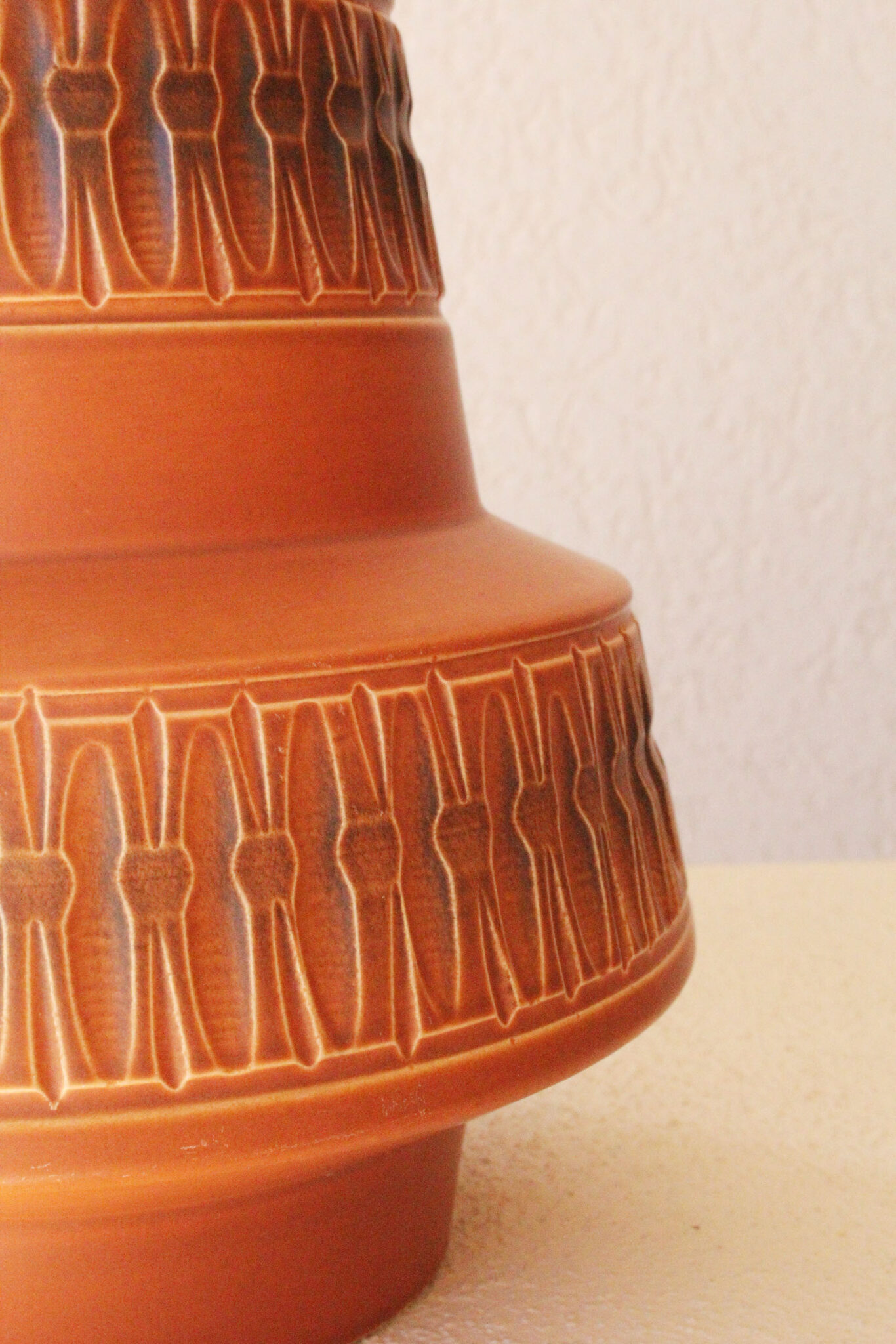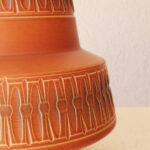 הכלי צבוע בגוון טרקוטה מהפנט ועליו עיטורים גאומטריים פיסוליים הנעשו בעבודת יד, המזוהים עם השפה העיצובית של חלק מהכלים שנעשו במפעל. שילוב של פריט דקורטיבי ופונקציונלי.