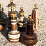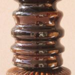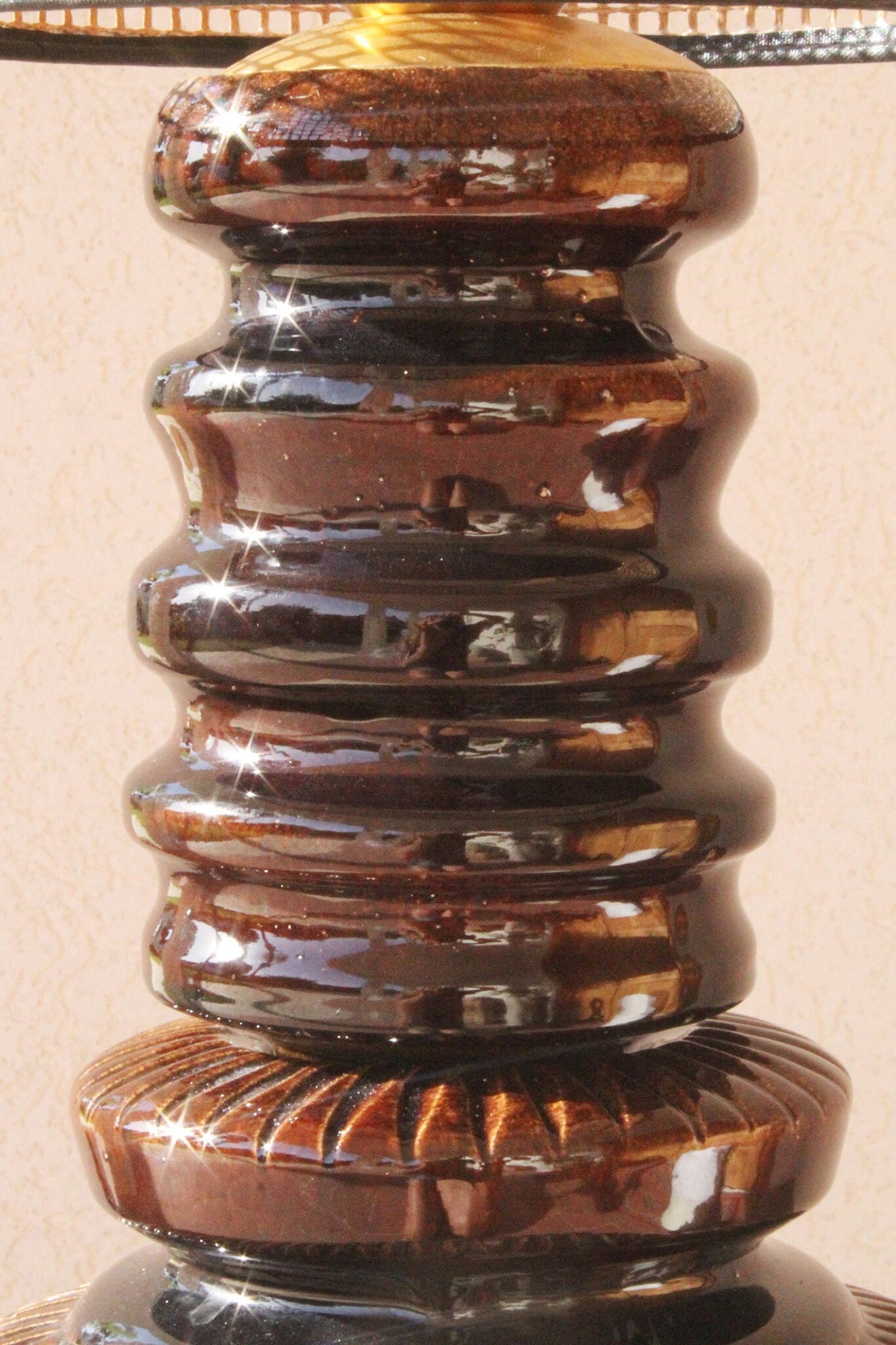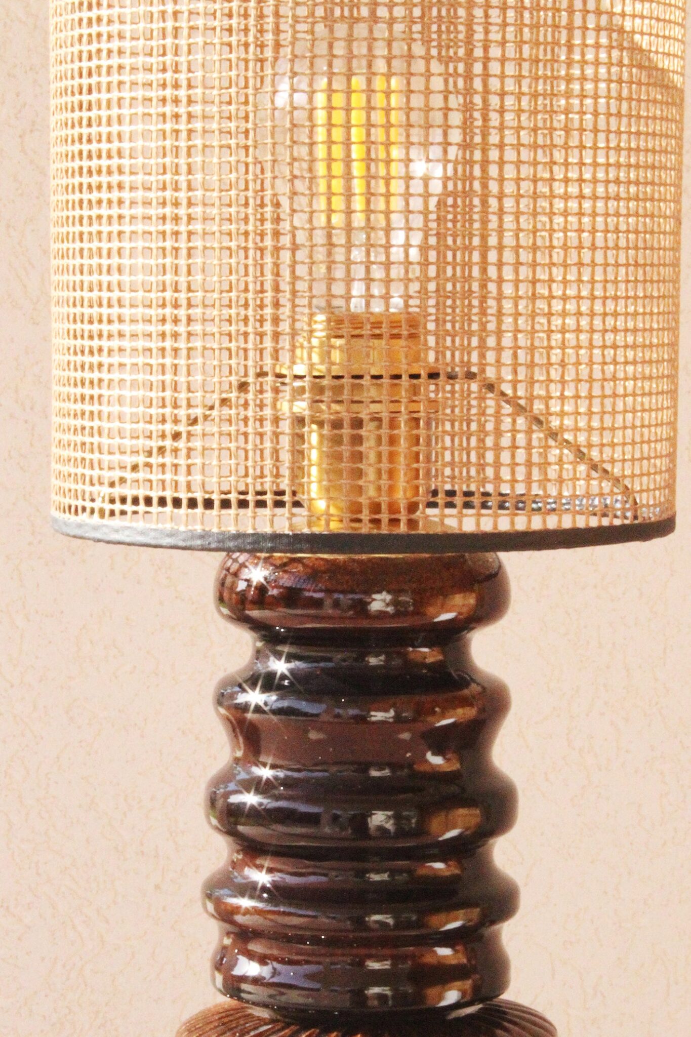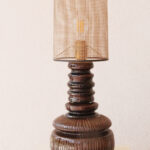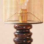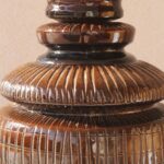 המנורה בנויה משני חלקים מחוברים, צבועה בגוון חום עמוק בגימור מבריק ומעוטרת בעיטורים גרפיים חרוטים בעבודת יד, המעניקים תחושה של עושר ועומק.