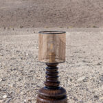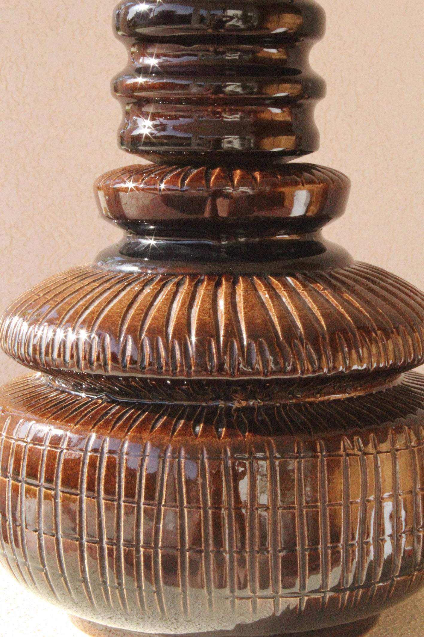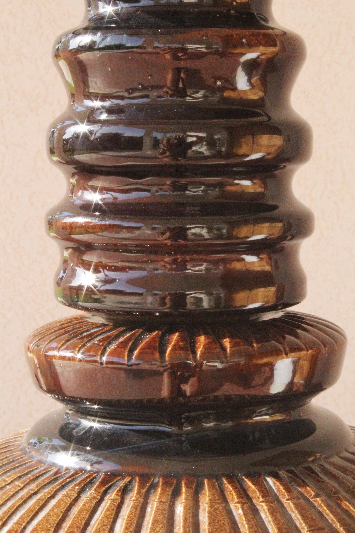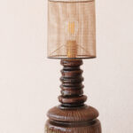 המנורה בנויה משני חלקים מחוברים, צבועה בגוון חום עמוק בגימור מבריק ומעוטרת בעיטורים גרפיים חרוטים בעבודת יד, המעניקים תחושה של עושר ועומק.