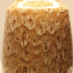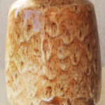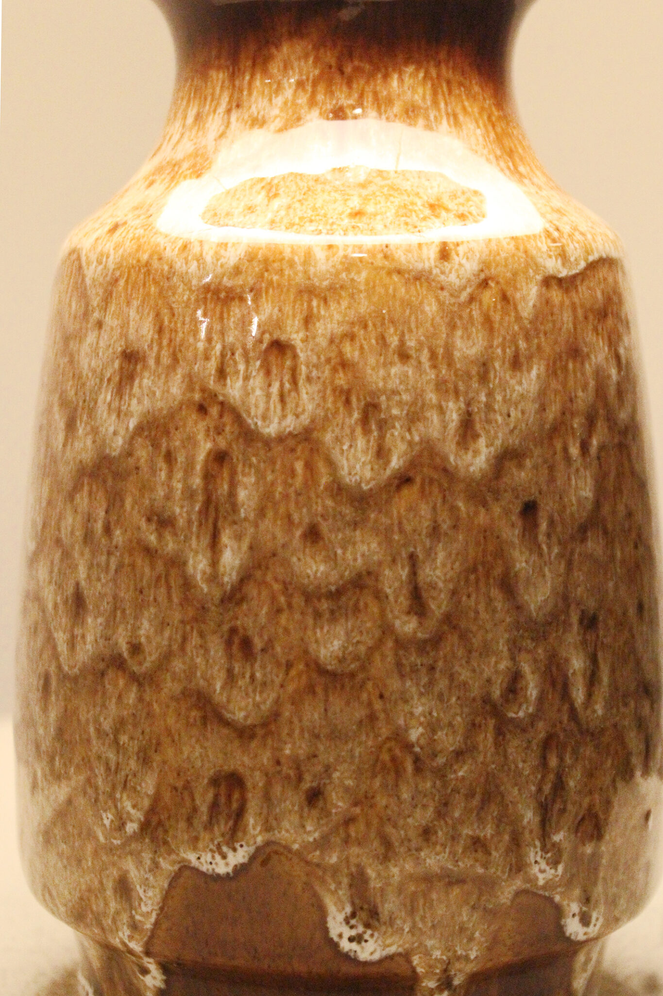 על הכלי גלזורה מרהיבה של צבעים נשפכים בצבעי כרמל וחרדל שמהם נוצרת תצוגת צבעים עשירה ודינמית. הפרטים המוזהבים שעל הכד מוסיפים לו מראה זוהר וגלאמי