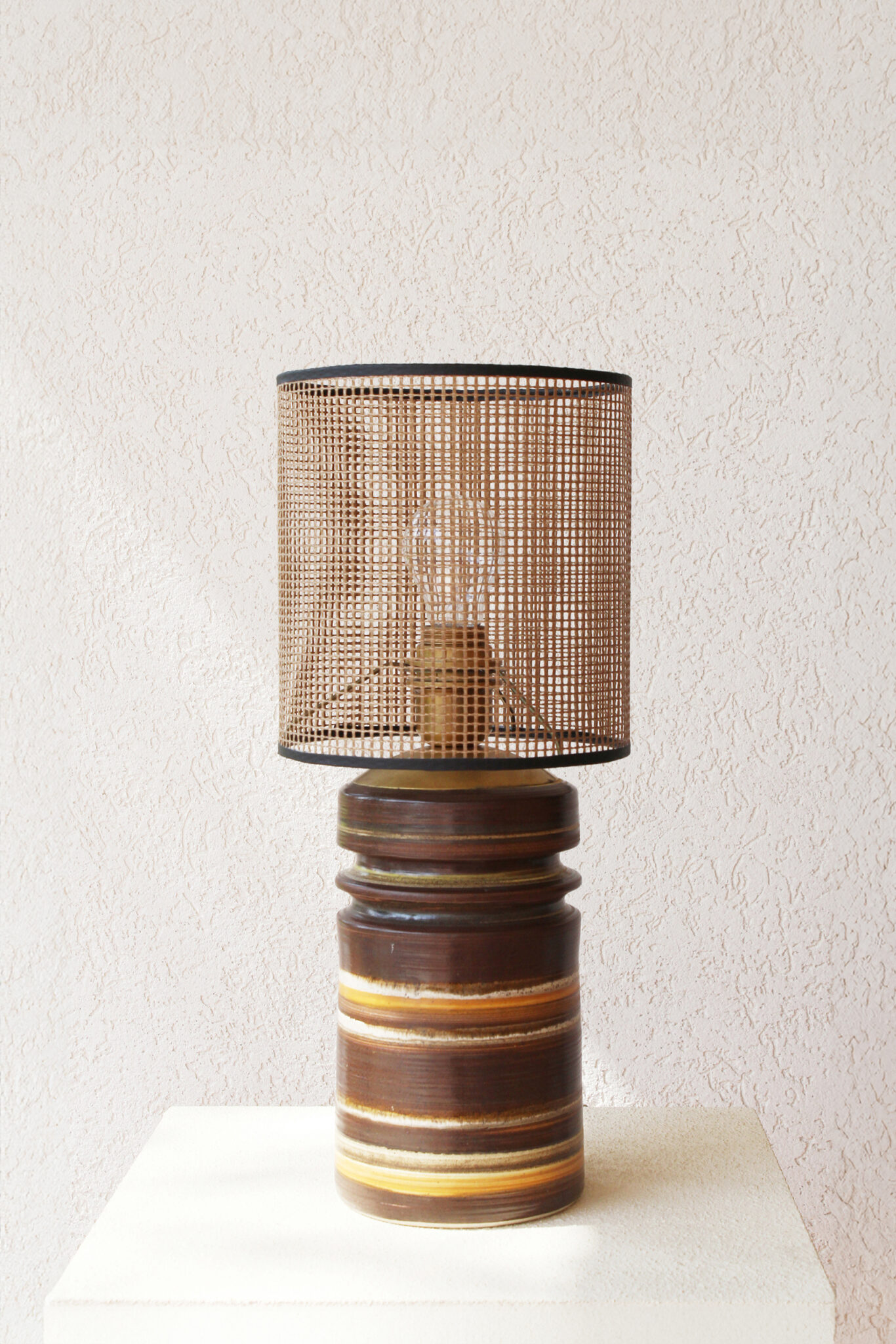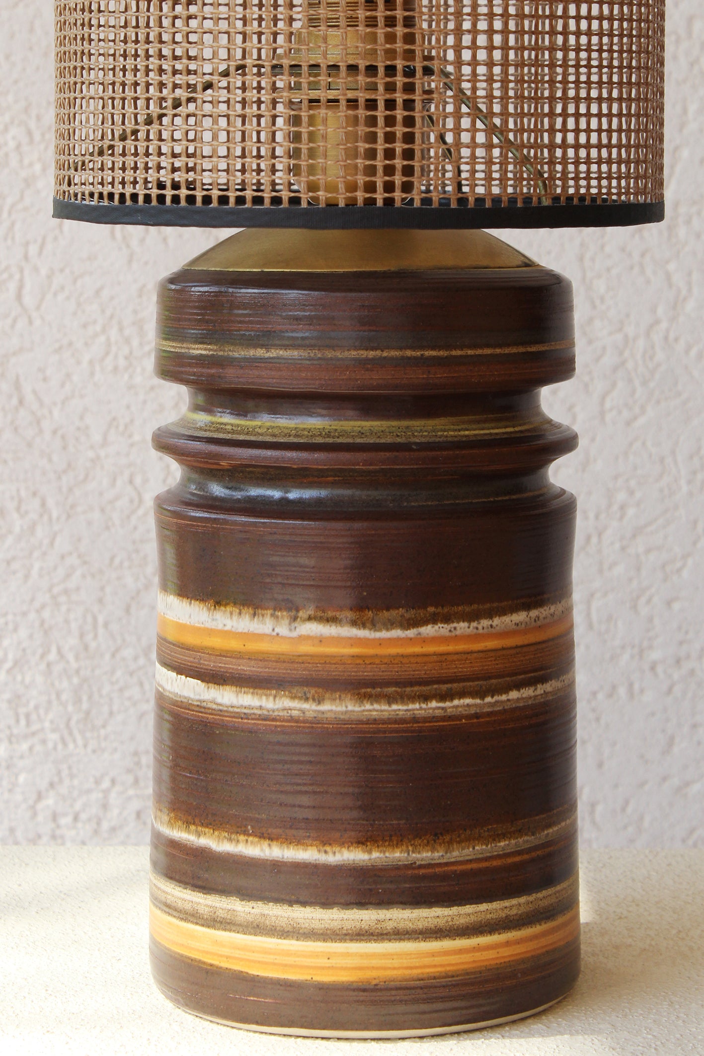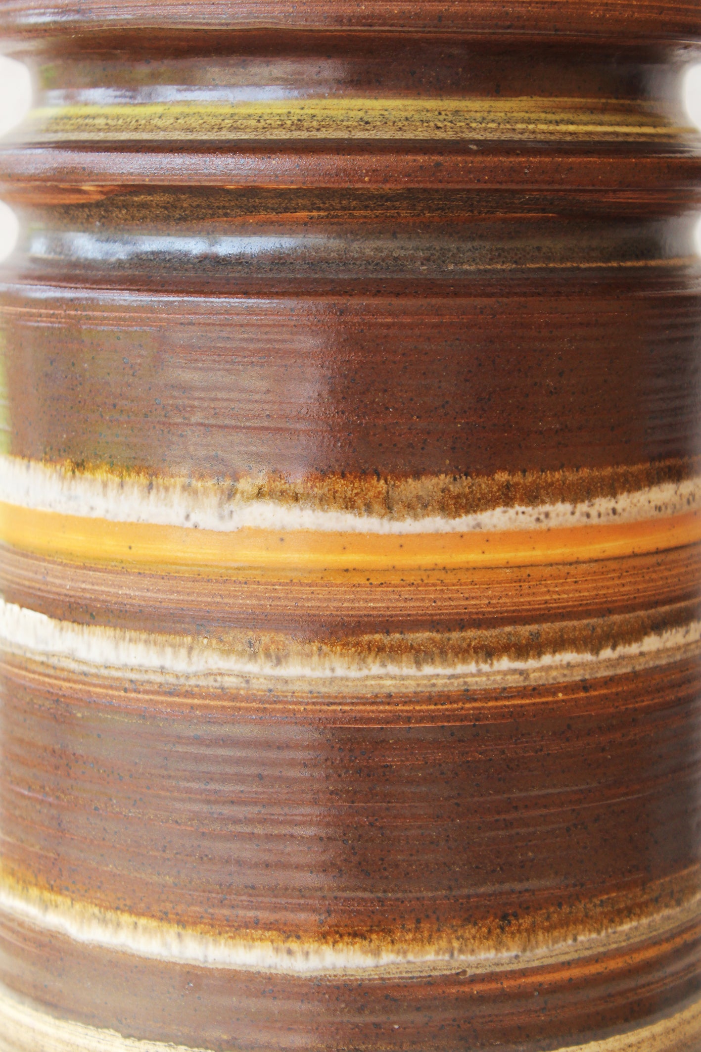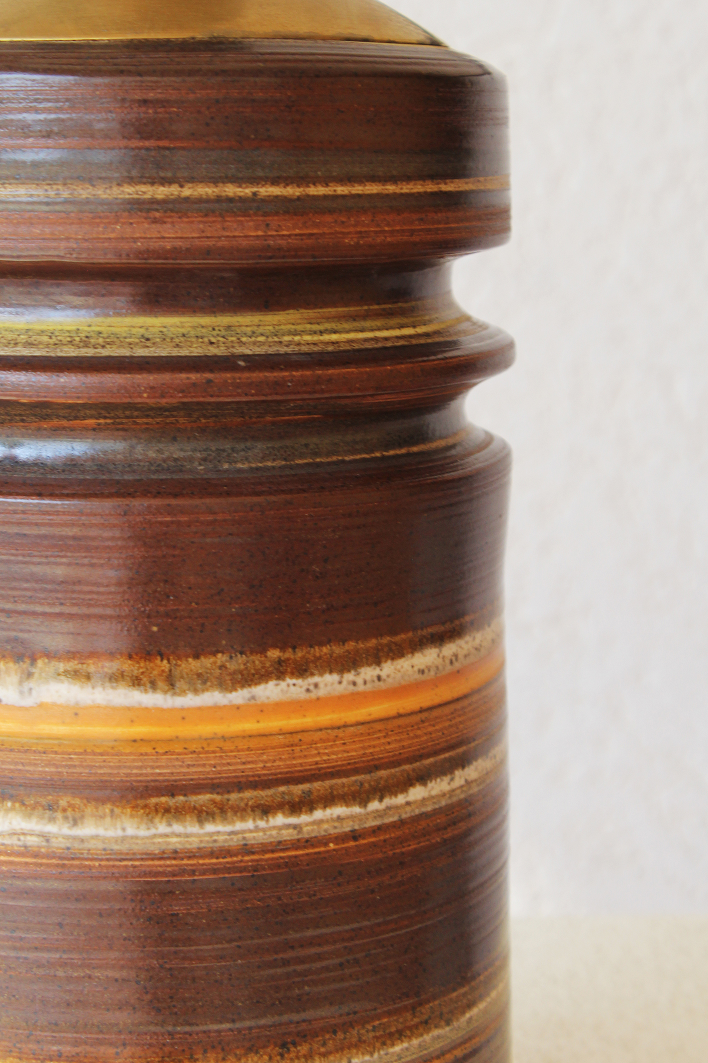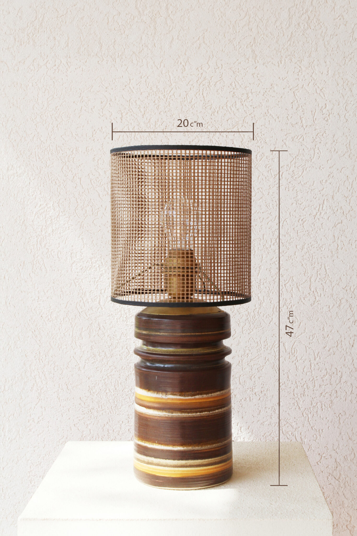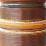 לכלי צבעוניות ייחודית הנעשתה בצורה ידנית. הגוון החום העמוק משתלב עם פסים לבנים וכתומים היוצרים מעברי צבע מעניינים וטקסטורה עשירה על גבי הקרמיקה.
