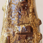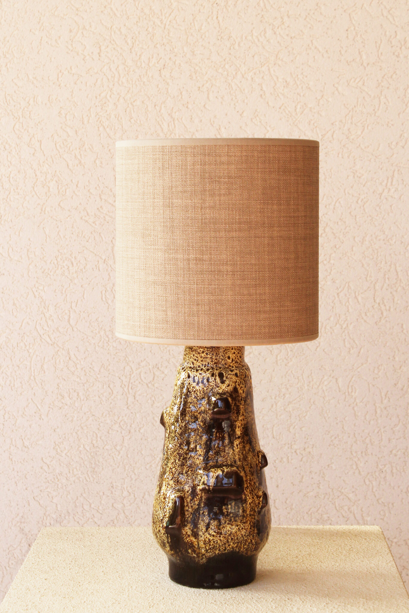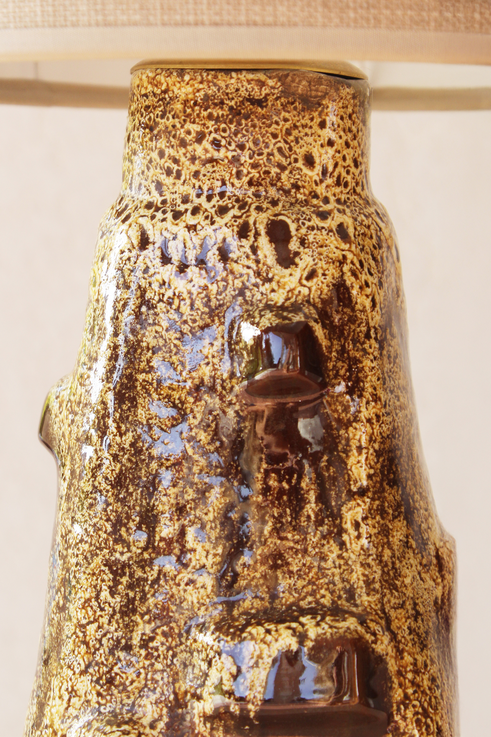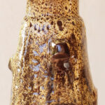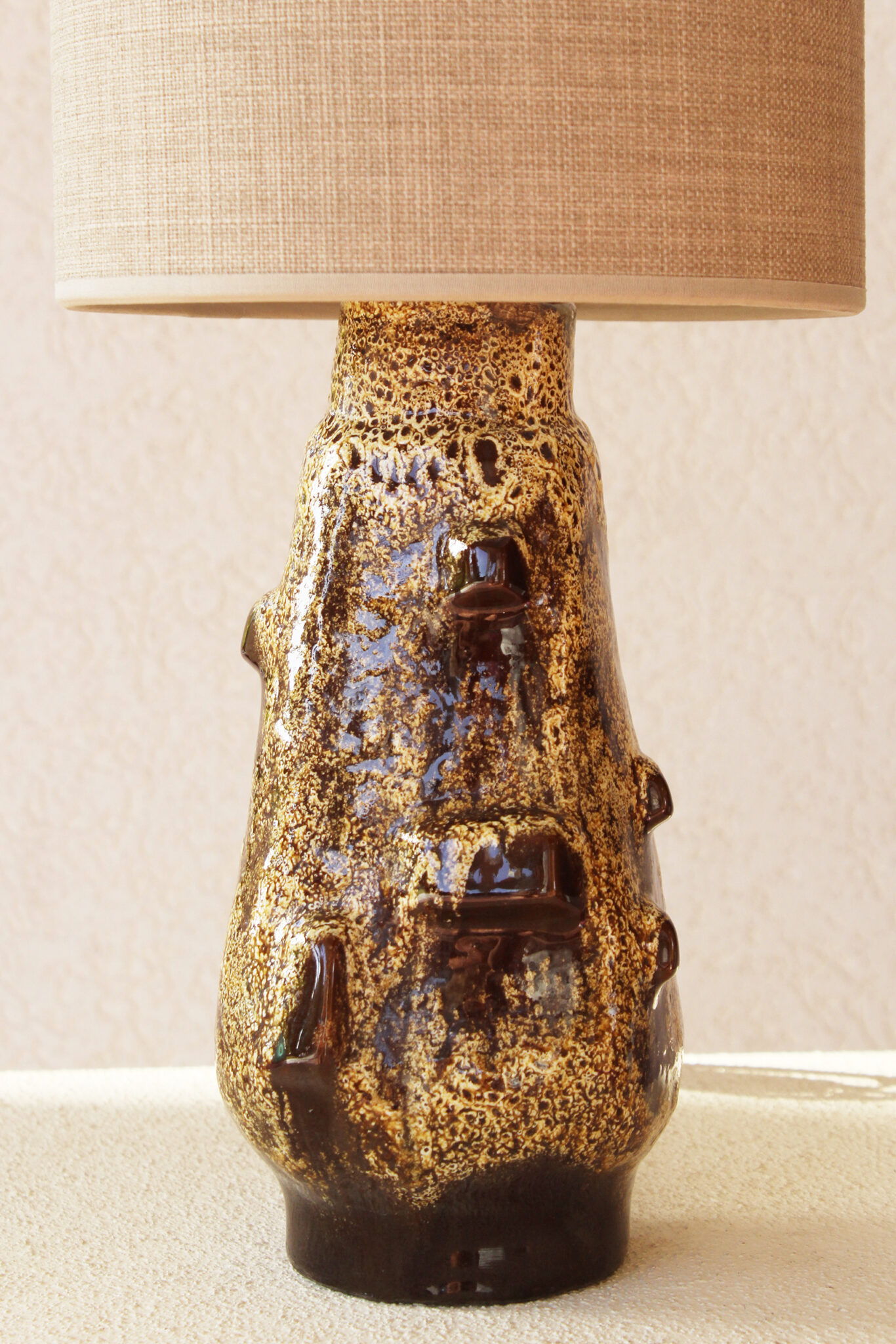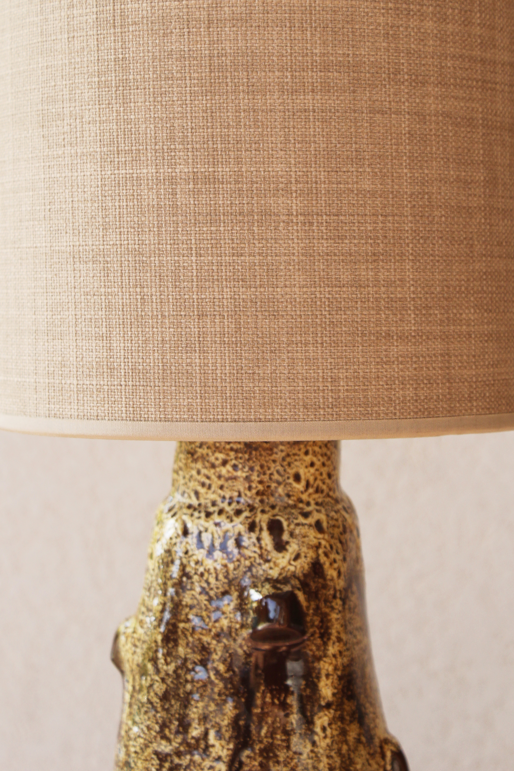 הכלי עשוי מקרמיקה, נעשה בעבודת יד, בעל טקסטורות מגוונות בגוונים עמוקים של חום ומתוכו יוצאות בליטות היוצרות נפח ועומק. פני השטח המבריקים מדגישים את העושר של הגלזורה ומשווים למנורה נוכחות חמה.